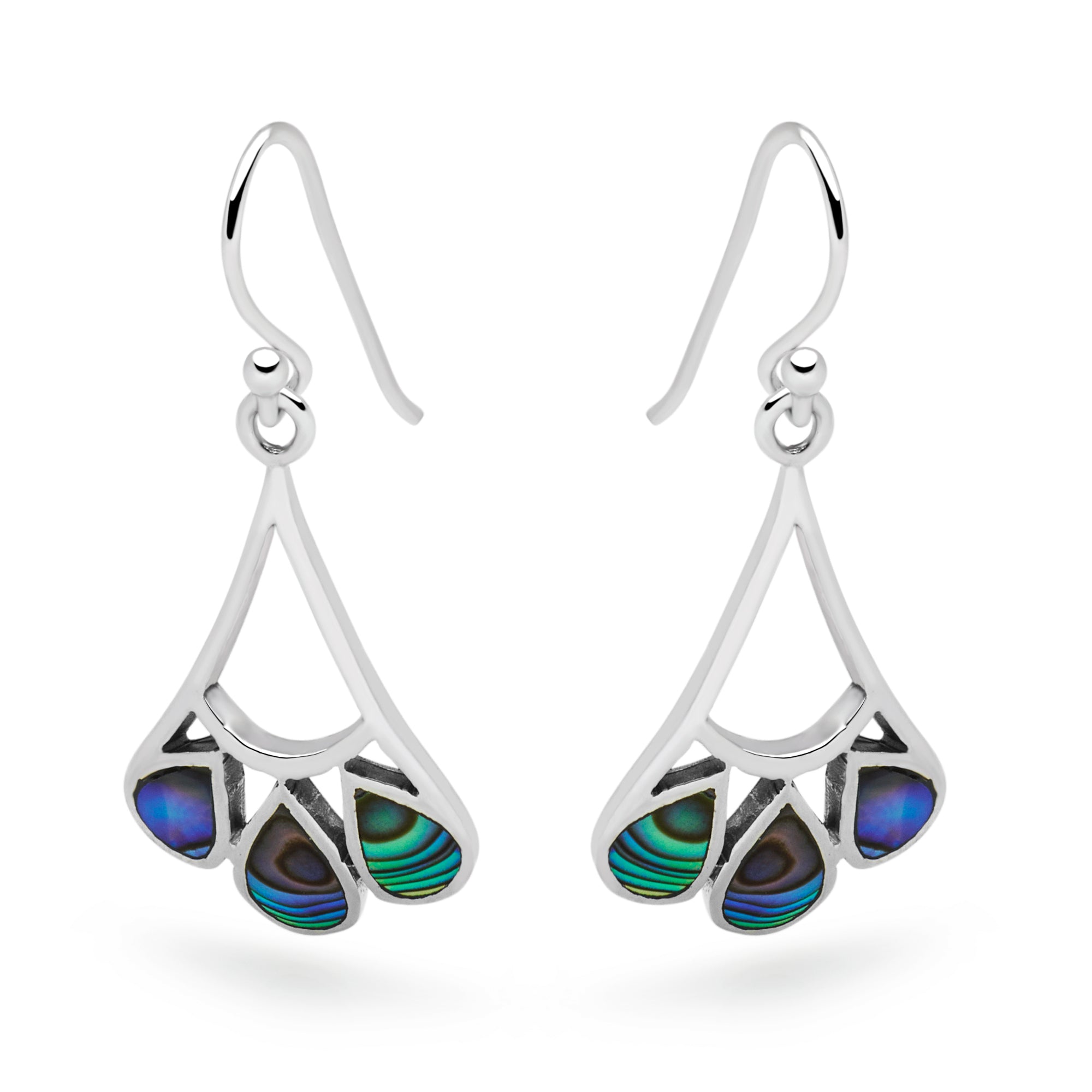 Make a statement with these elegant sterling silver drop earrings, featuring three shimmering abalone insets that reflect a stunning play of oceanic colour. Each natural shell catches the light with iridescent hues of blue, green, and violet, adding a touch of vibrant sophistication to your look.