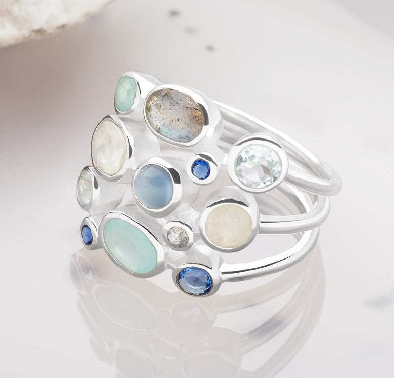 A stunning array of oceanic hues made up from labradorite, blue topaz, chalcedony, iolite and moonstone.