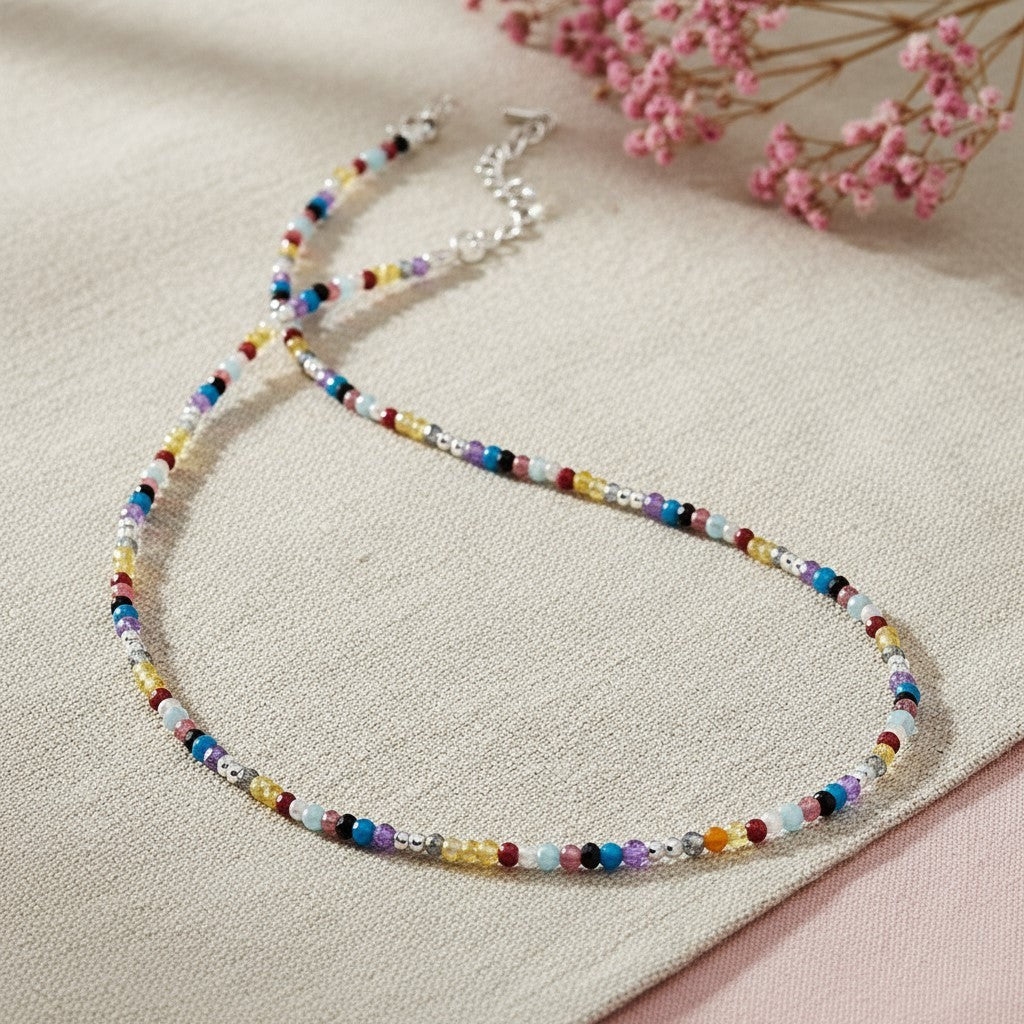 A delicate celebration of colour and light. Tiny faceted beads in shades of purple, blue, pink, green, black, and clear glimmer softly as they catch the light, each hue separated by polished sterling silver accents. Subtle yet full of charm, this necklace adds a whisper of sparkle and a touch of playfulness to every look — perfect for layering or wearing on its own.