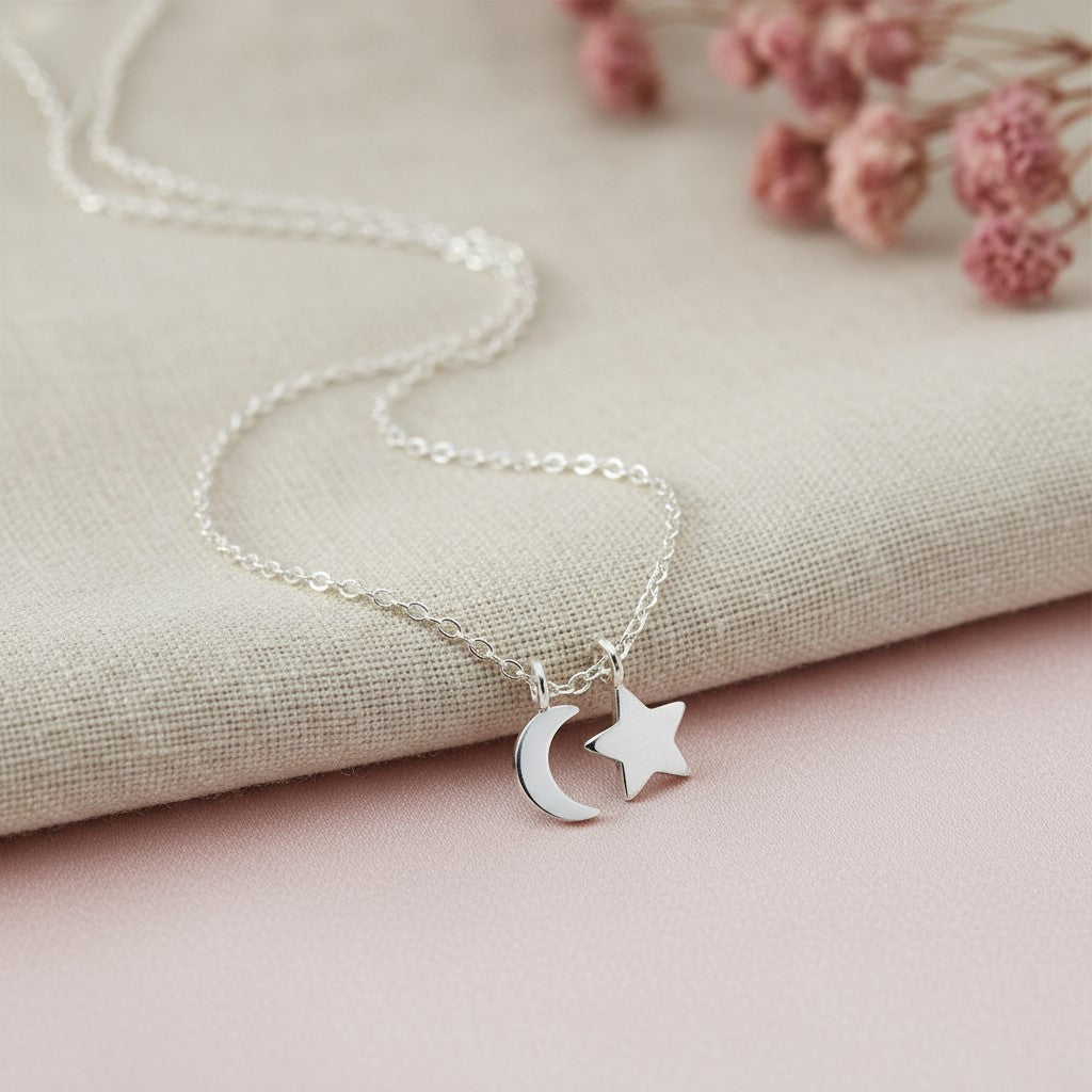 Delicate and dreamy, this dainty pendant captures the quiet magic of a starlit night. Crafted from shimmering sterling silver, a tiny crescent moon cradles a twinkling star - a perfect pair for dreamers, stargazers, and night owls alike.