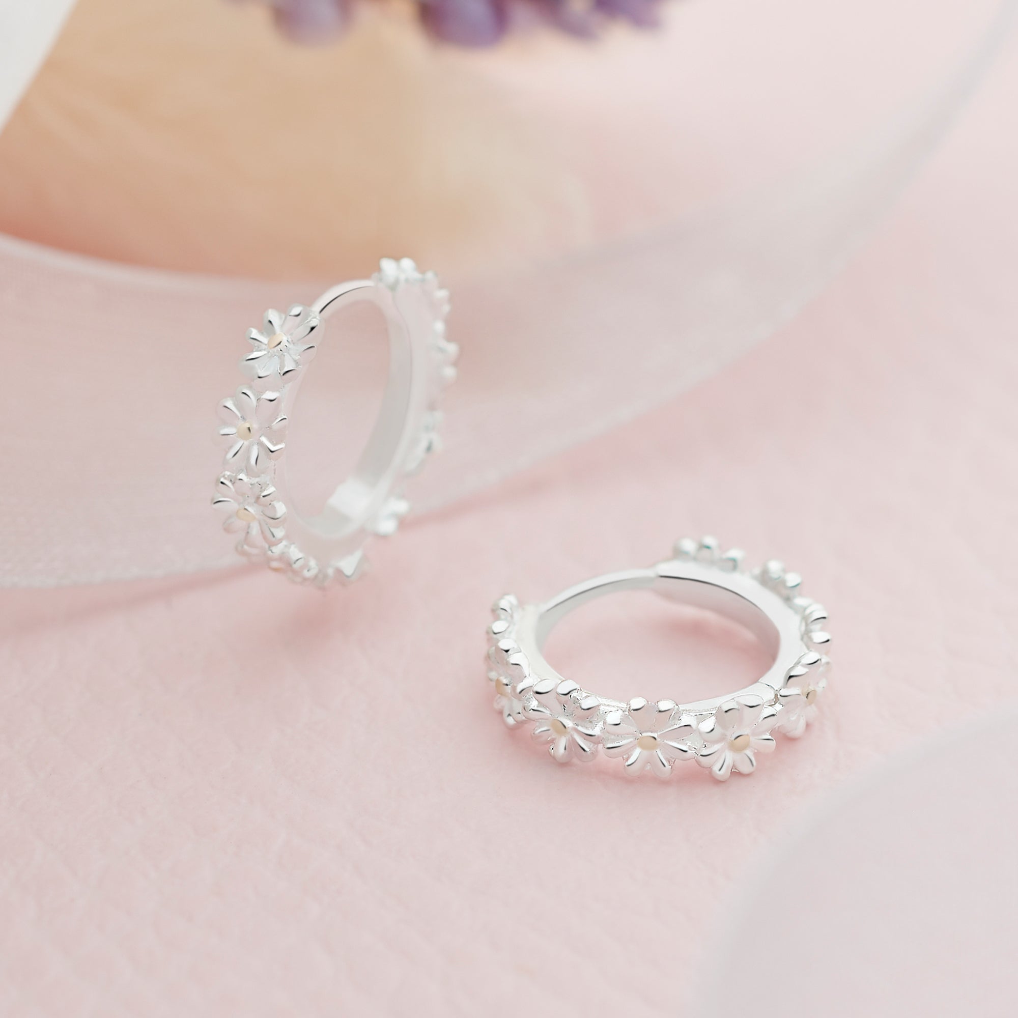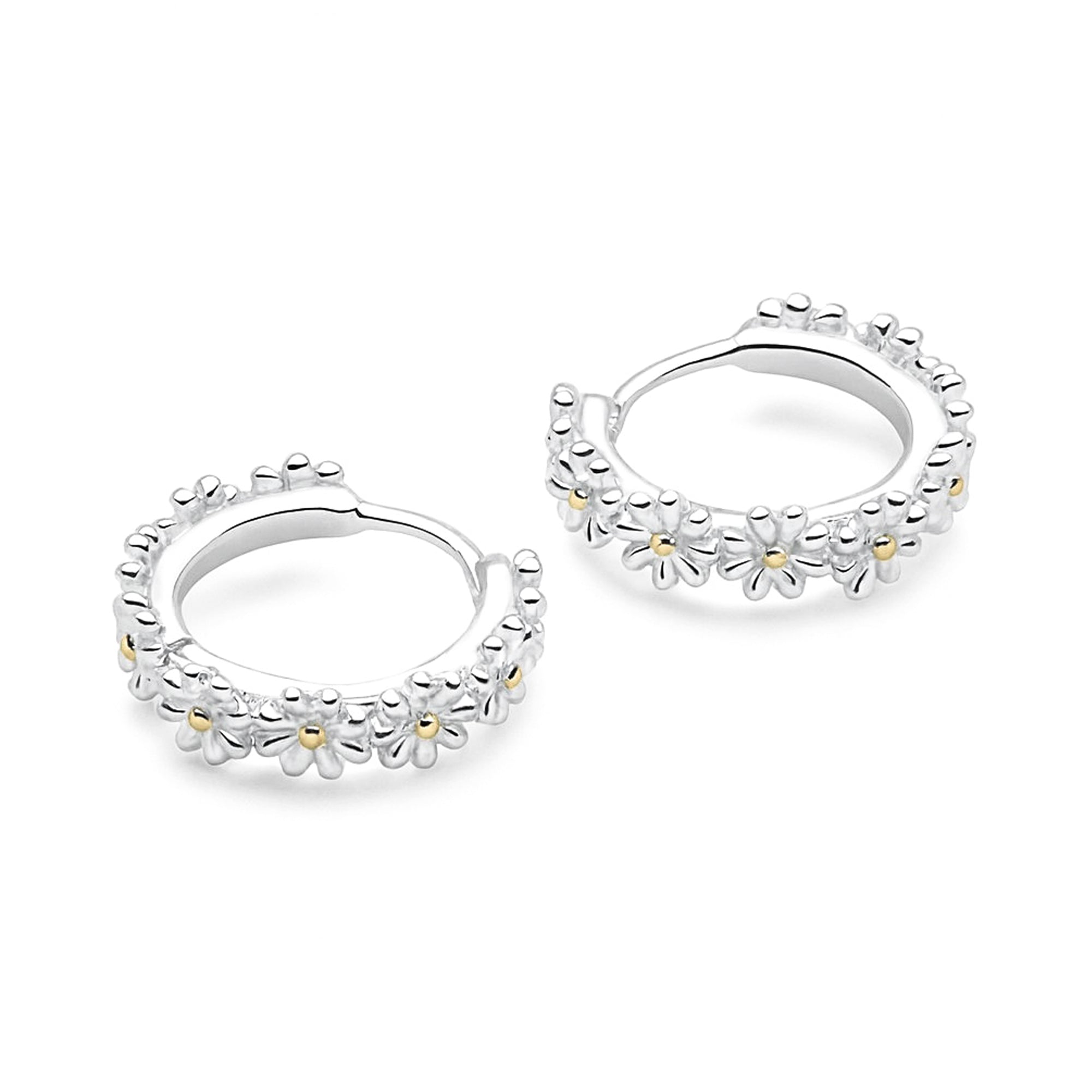 These Daisy Chain Hoop earrings feature stunning hoops made of delicious daisies with gold-plated centres, finished on a hinged setting.