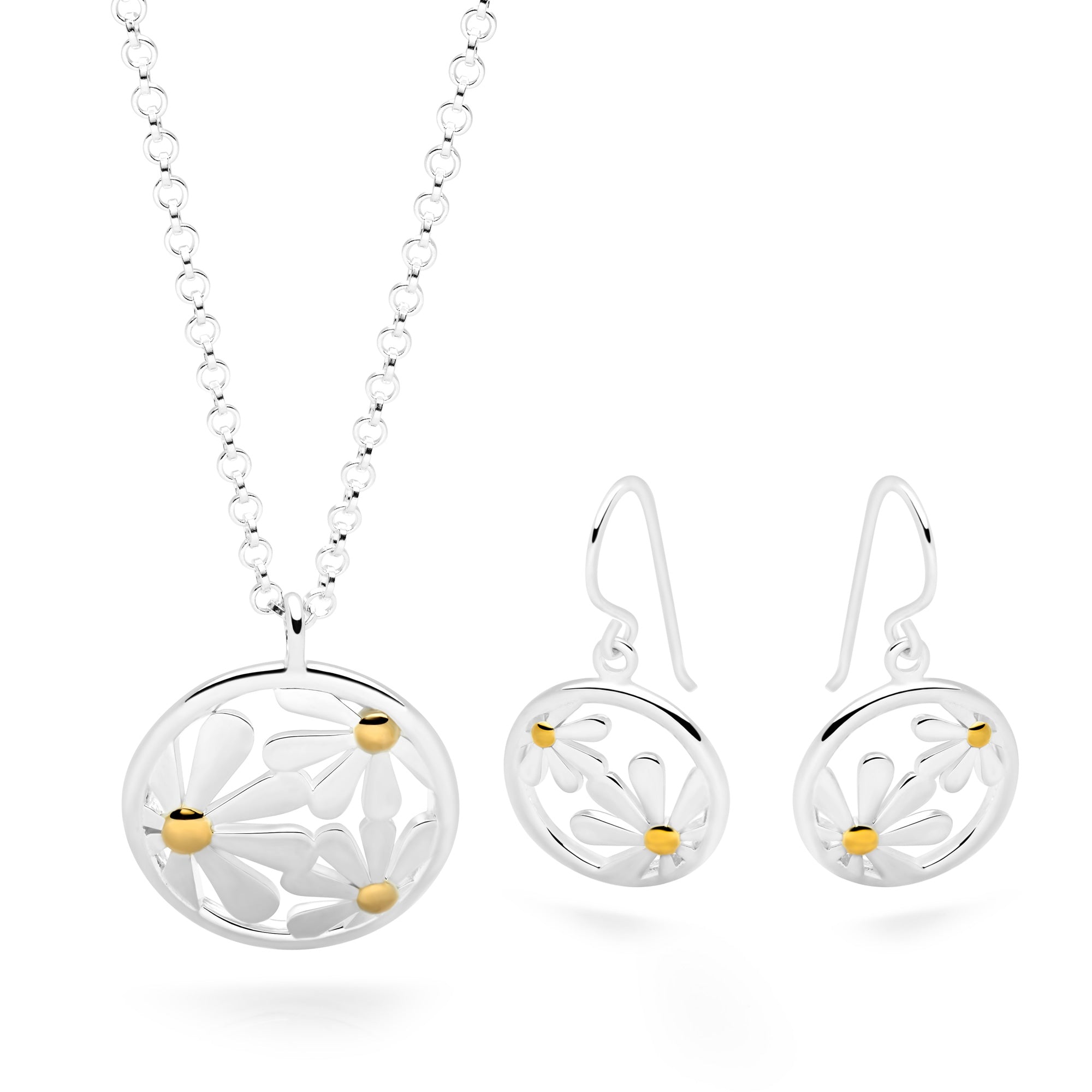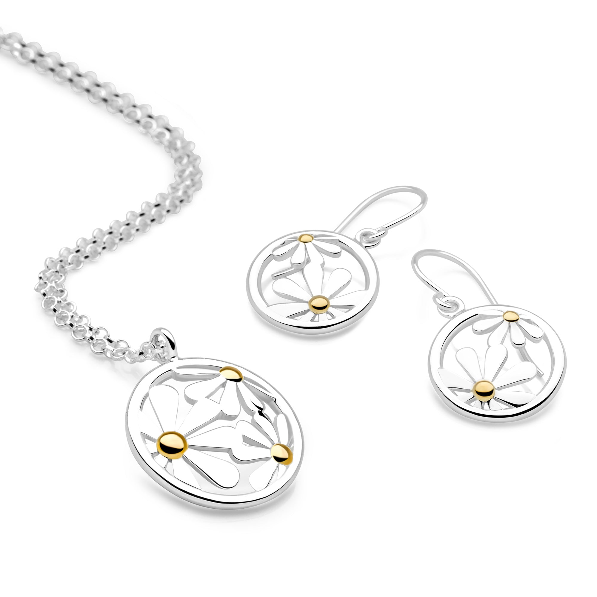 Cut-out daisies with bright gold plated centers embrace your neckline to add on trend, springtime vibes.