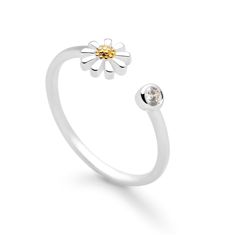 This pretty ring starts with a delicate daisy on one side and finished with a gleaming cubic zirconia on the other. Slightly adjustable for a comfortable fit.