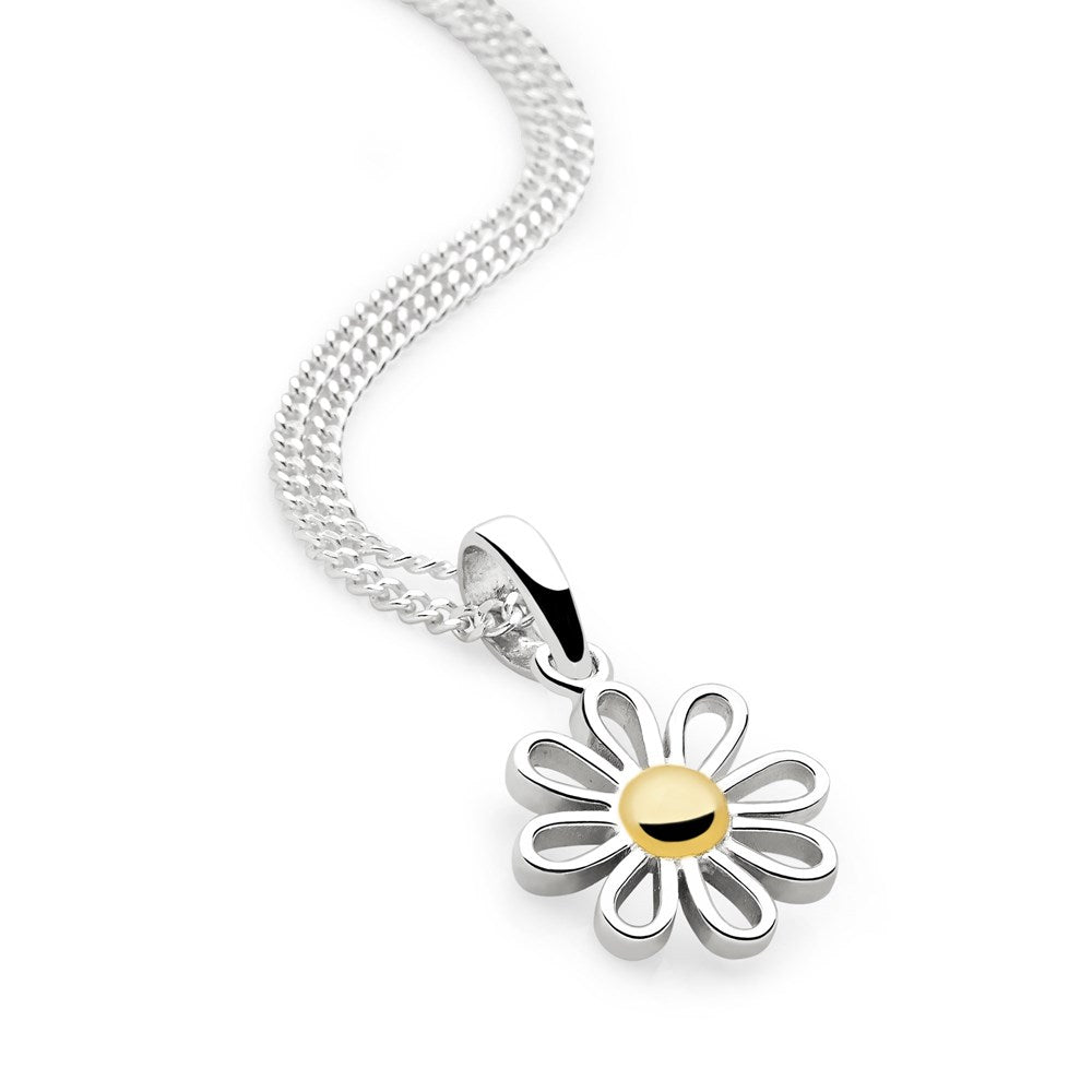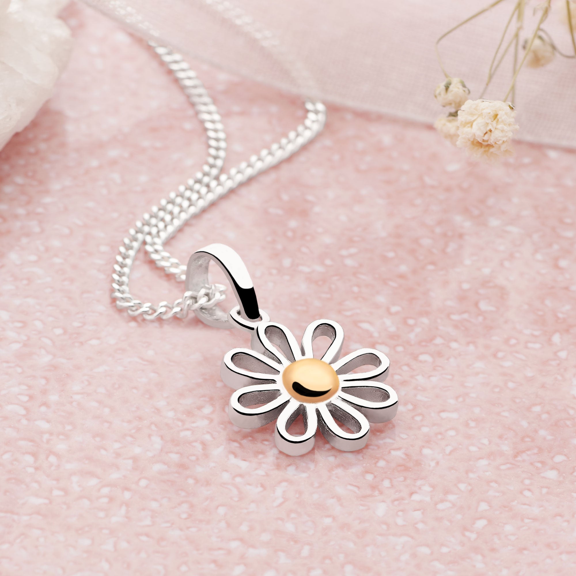 This beautifully crafted daisy with bright silver petals and a golden stamen gracefully sits below your neckline.