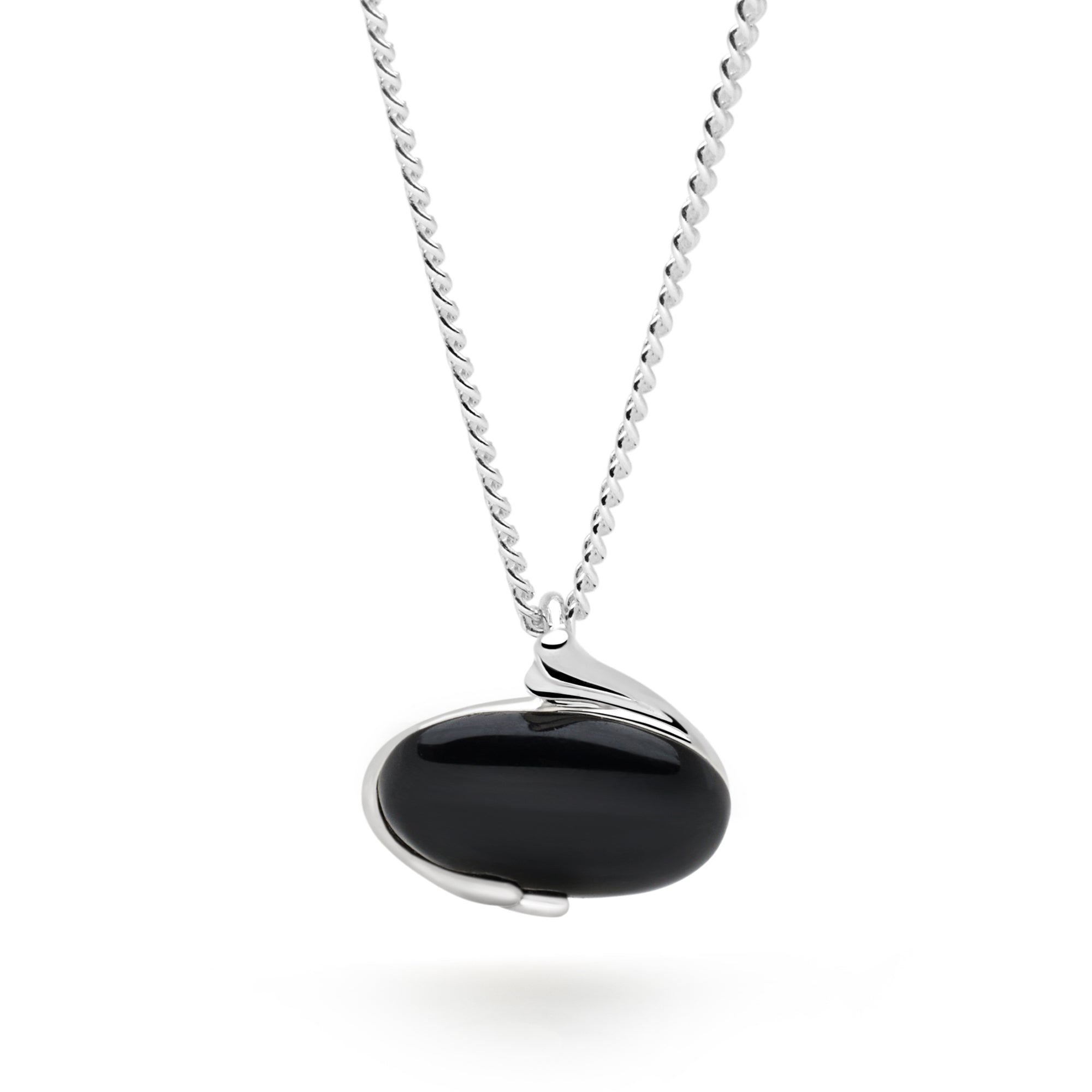 A smooth black onyx cabochon is set horizontally at the centre of this pendant, cradled by a flowing sweep of 925 sterling silver. The silver detail subtly fans out at the centre top and bottom, creating a sculptural form that highlights the natural depth and polish of the stone.