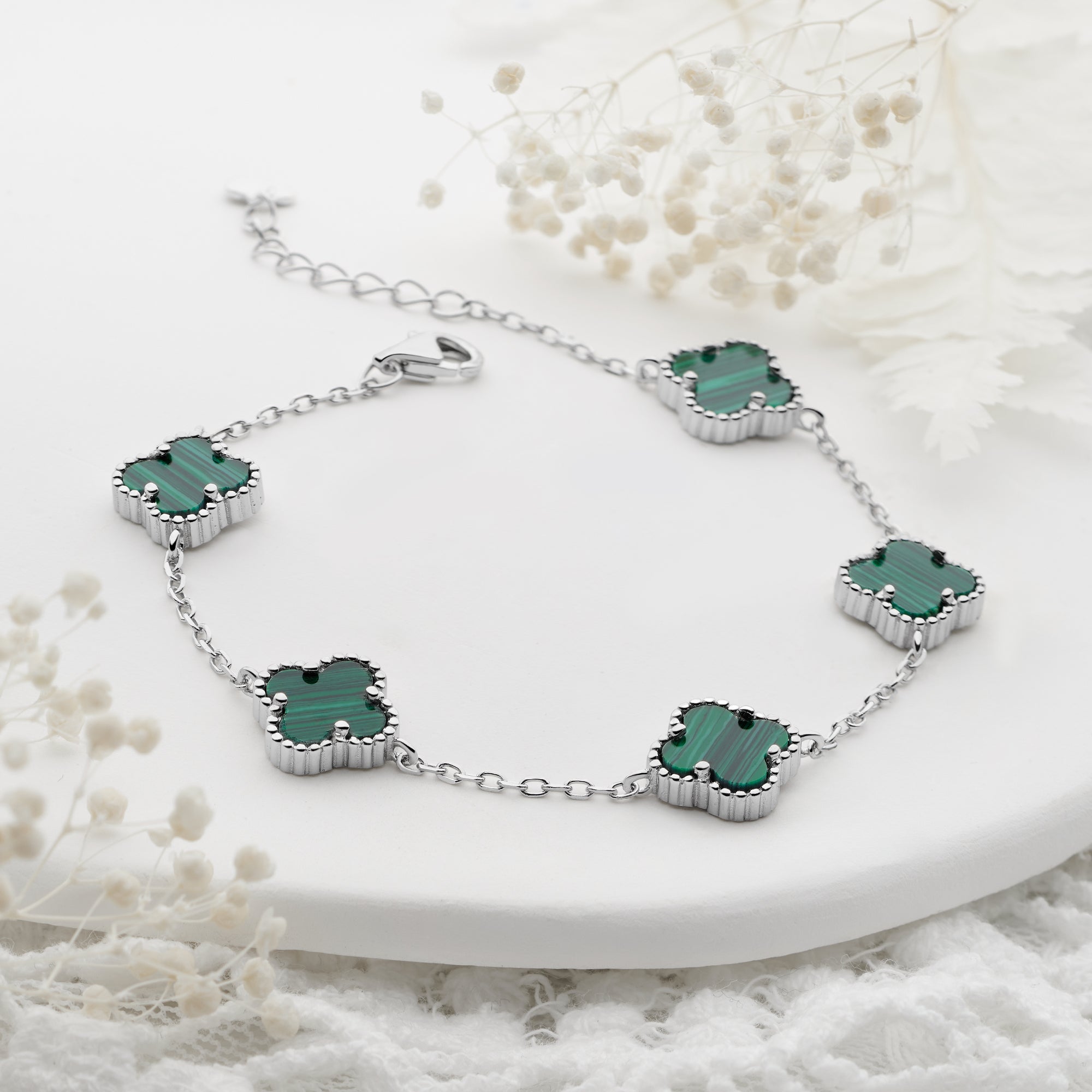 Bold and bright, this bracelet showcases five rippled green resin clovers delicately linked along a rhodium-plated silver chain. Each clover symbolises luck, love, and harmony, while the rich green adds timeless grace. A versatile piece that pairs beautifully with any look elegant on its own or layered for modern sophistication.