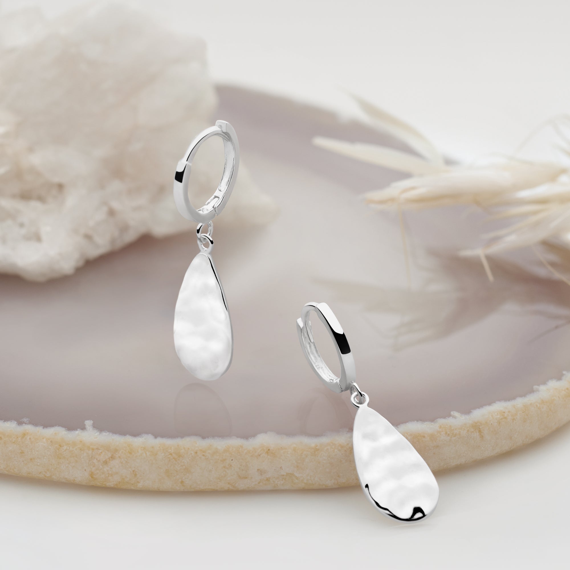 Timeless with a textural twist, these classic hoop earrings feature a secure hinge closure and elegant silver teardrop charms suspended from each hoop. Crafted in 925 sterling silver, the smooth, polished hoops contrast beautifully with the hammered surface of the teardrops, creating subtle movement and light-catching detail.