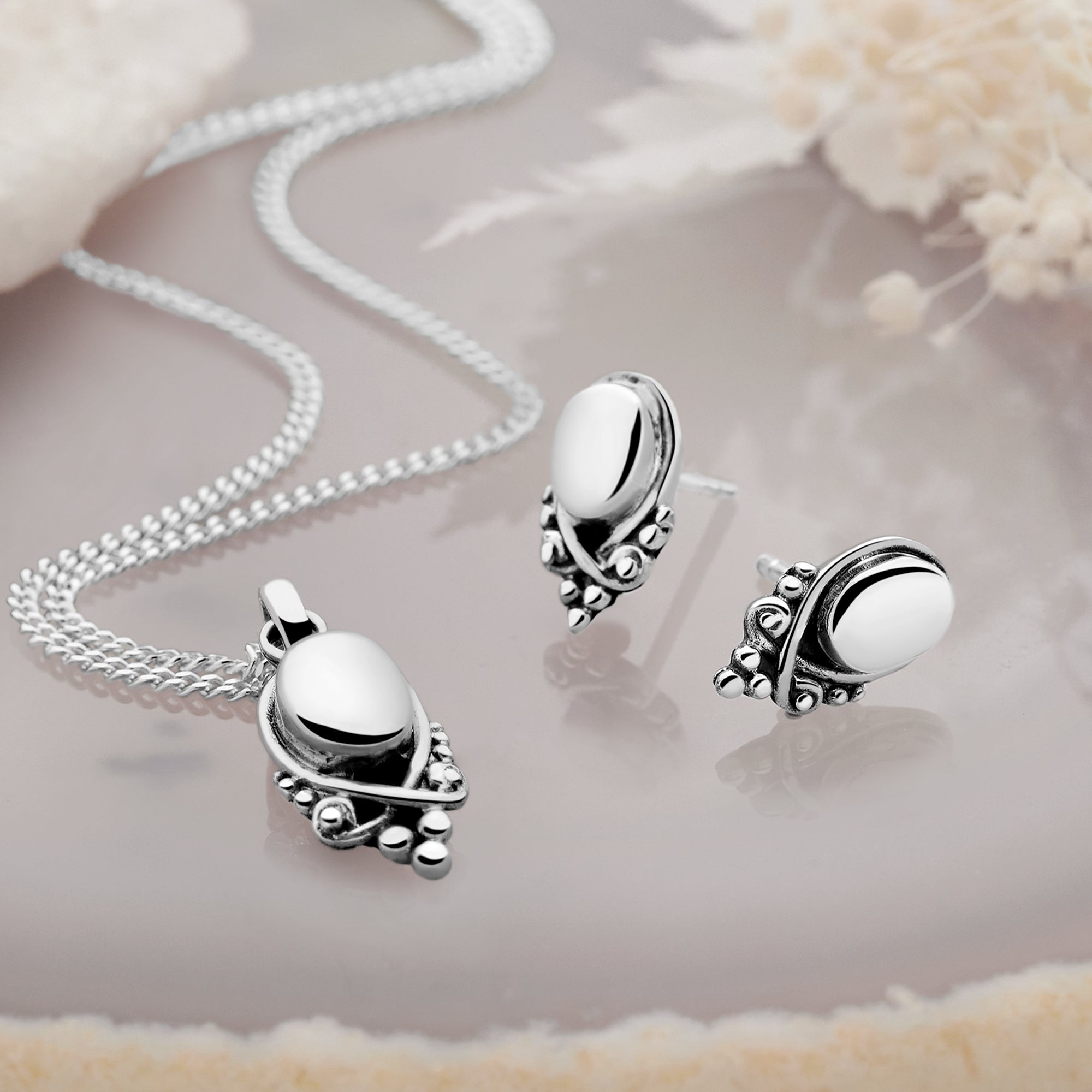 This iconic silver tear pendant crafted by hand is surrounded by a beautifully decorated frame and contrasted with deep oxidised depths.