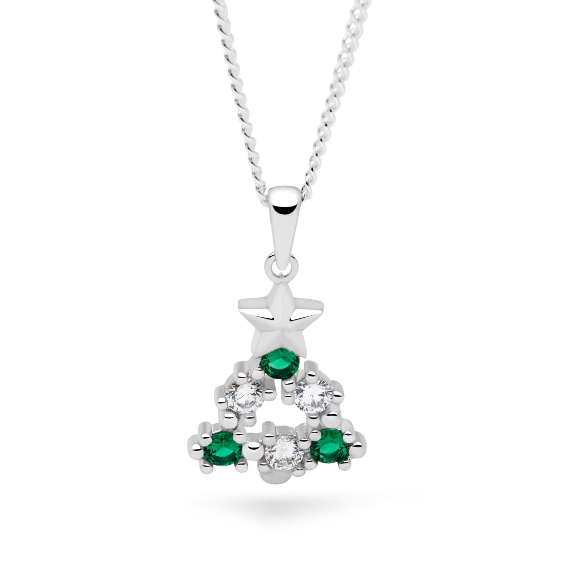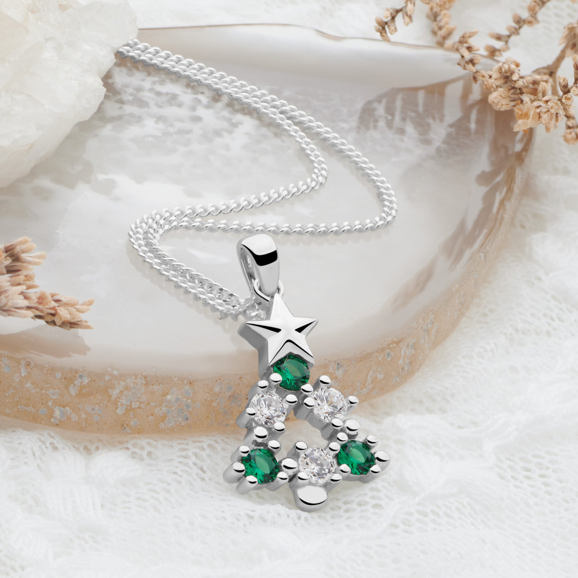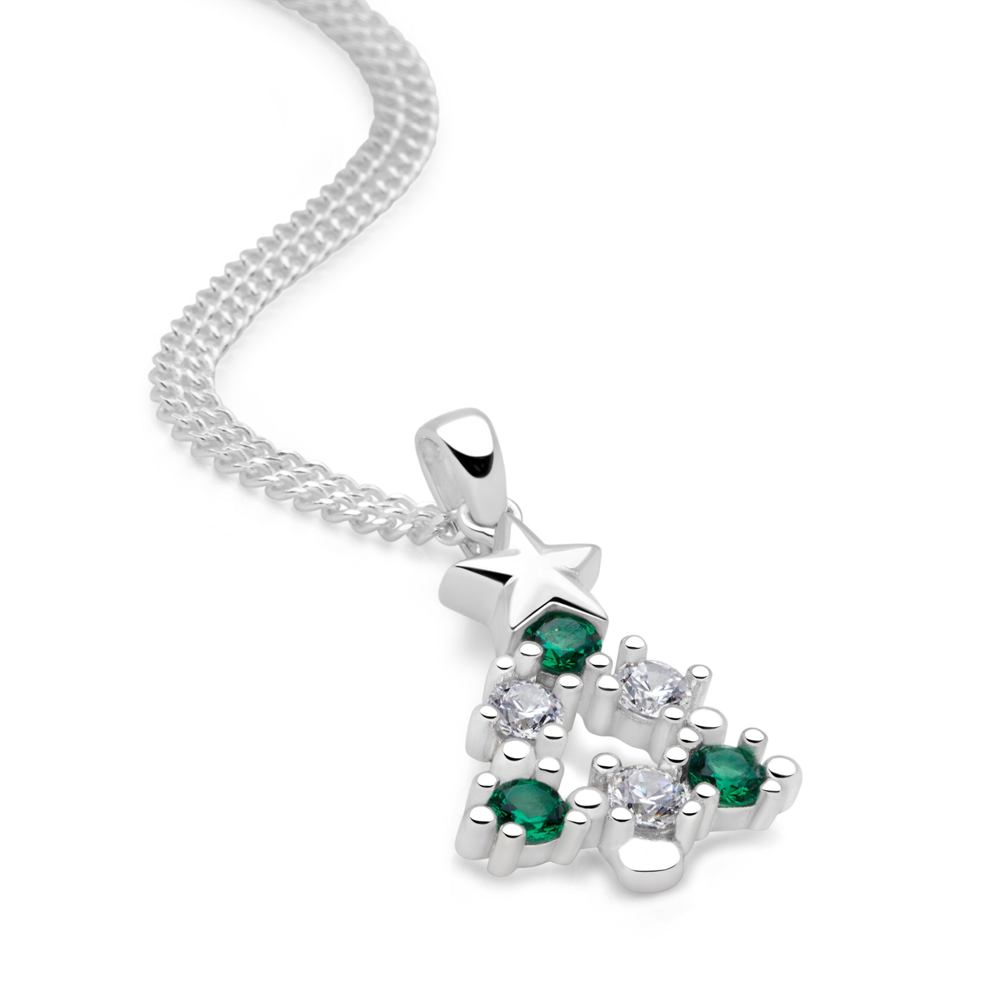 The cutest Christmas tree embellished with green and white cubic zirconia and finished with a silver star on top.