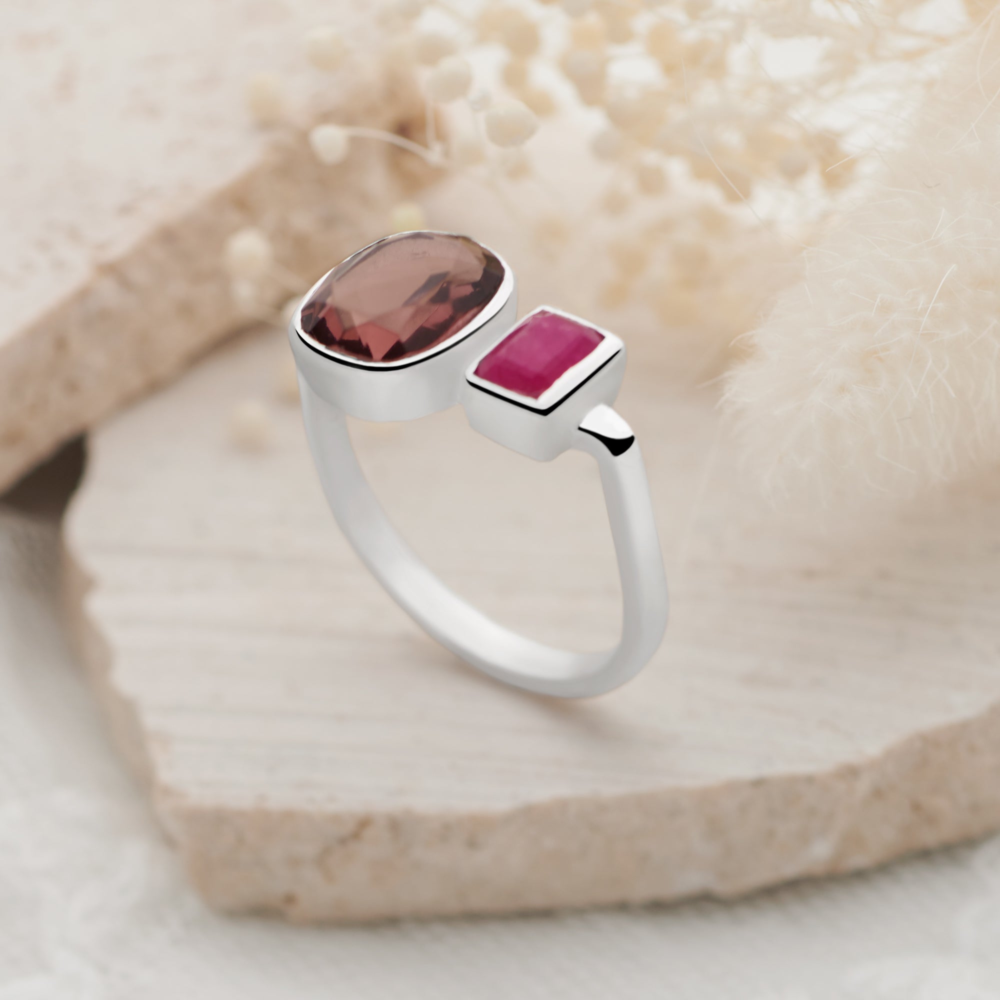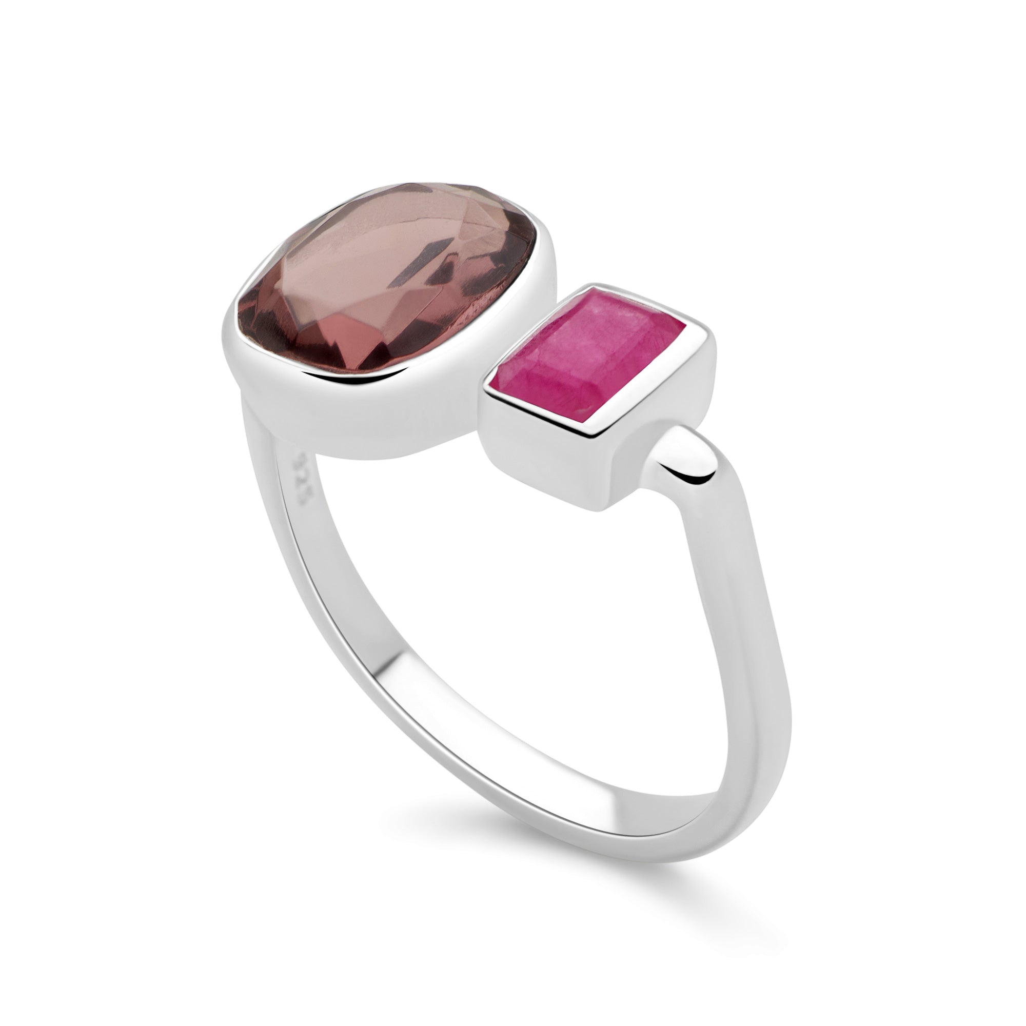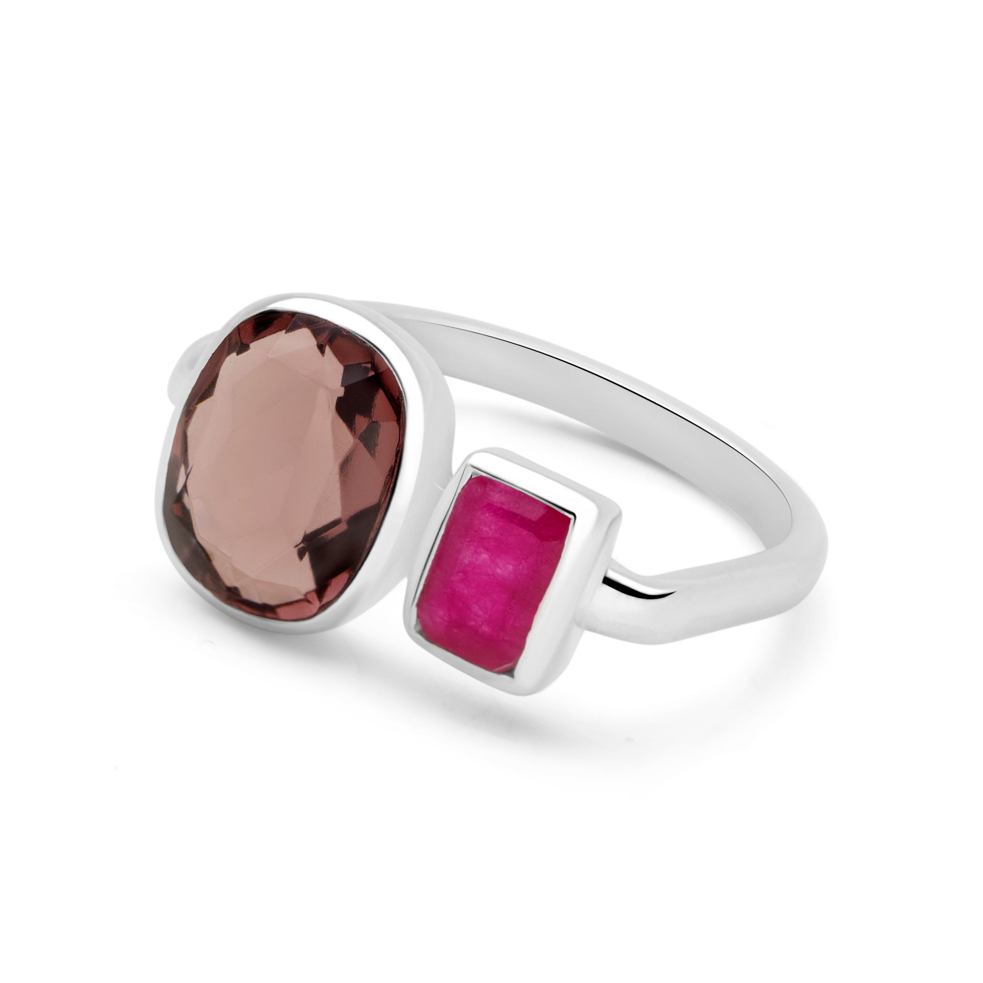 Squared pink jade meets a rhodolite hydro oval gently faceted emitting a soft yet radiant glow.