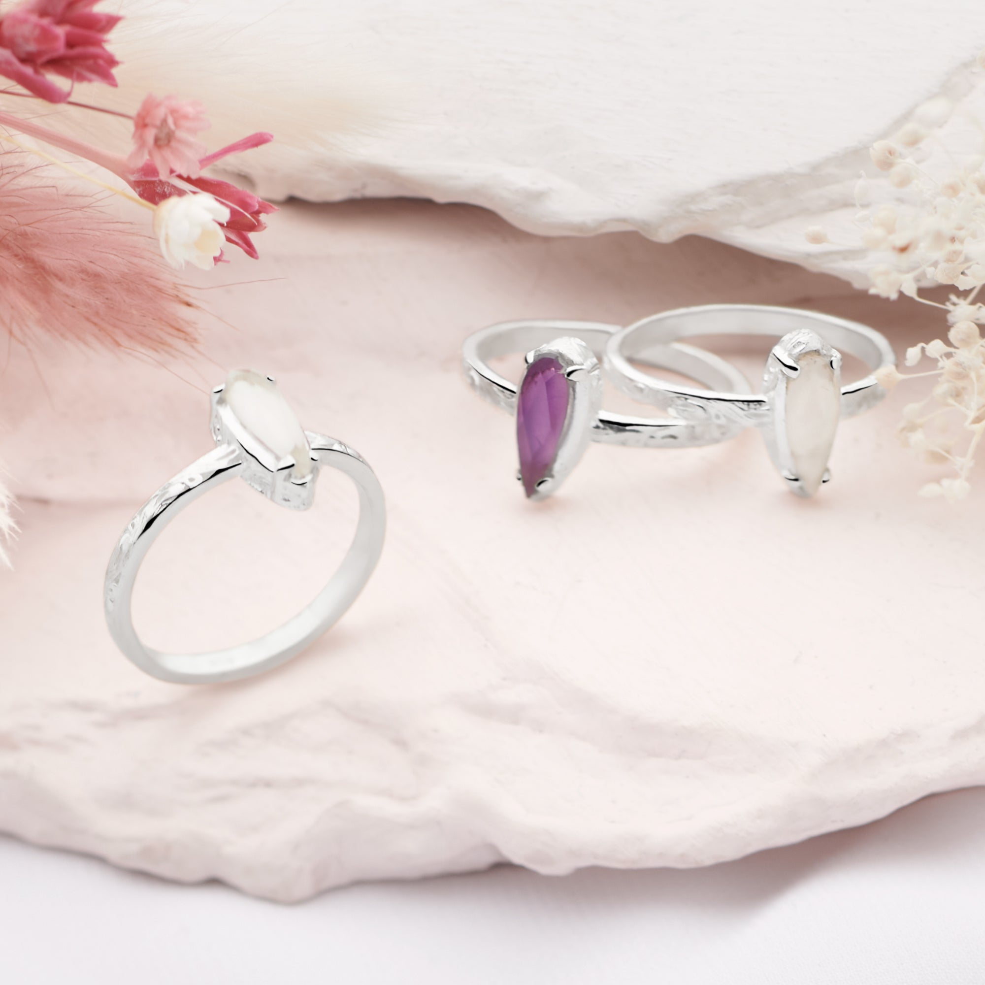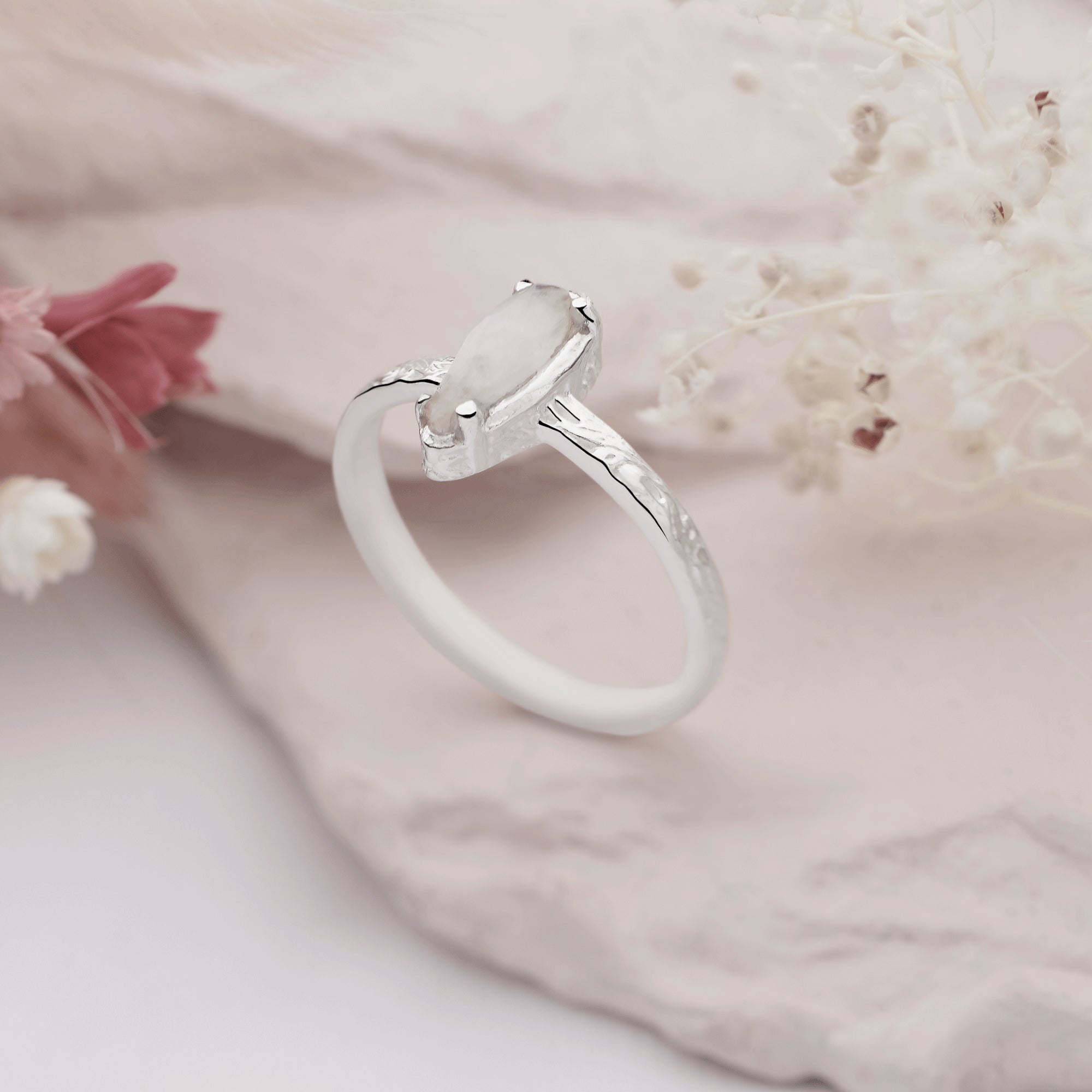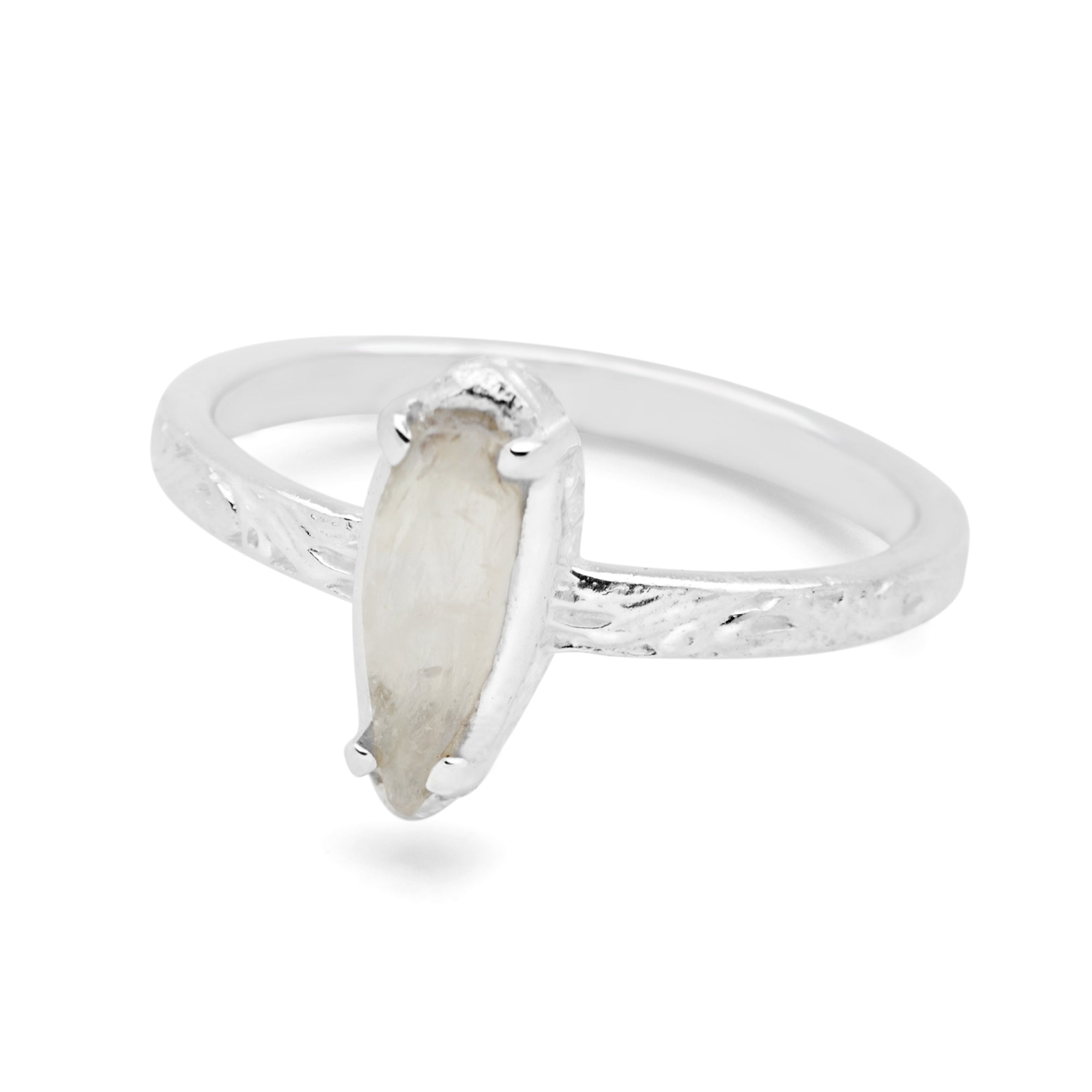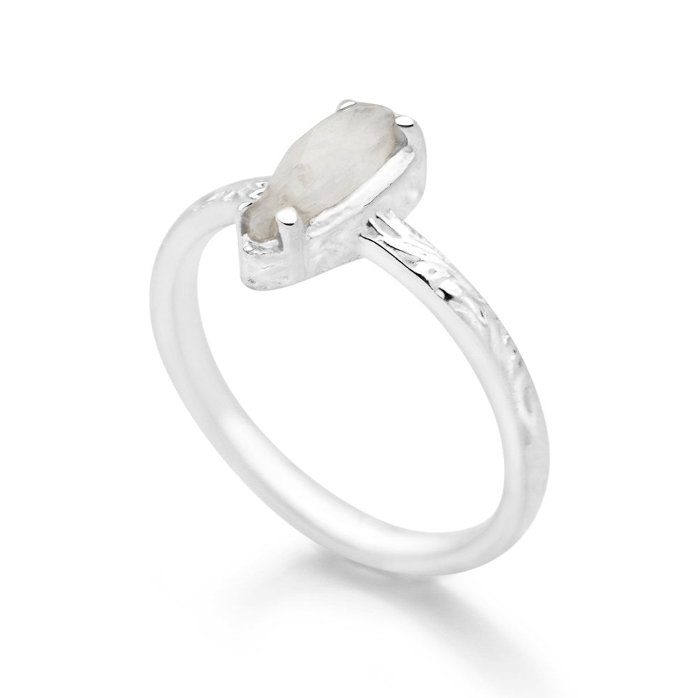 A precision-cut teardrop of moonstone sits upon an ornately decorated band of silver.