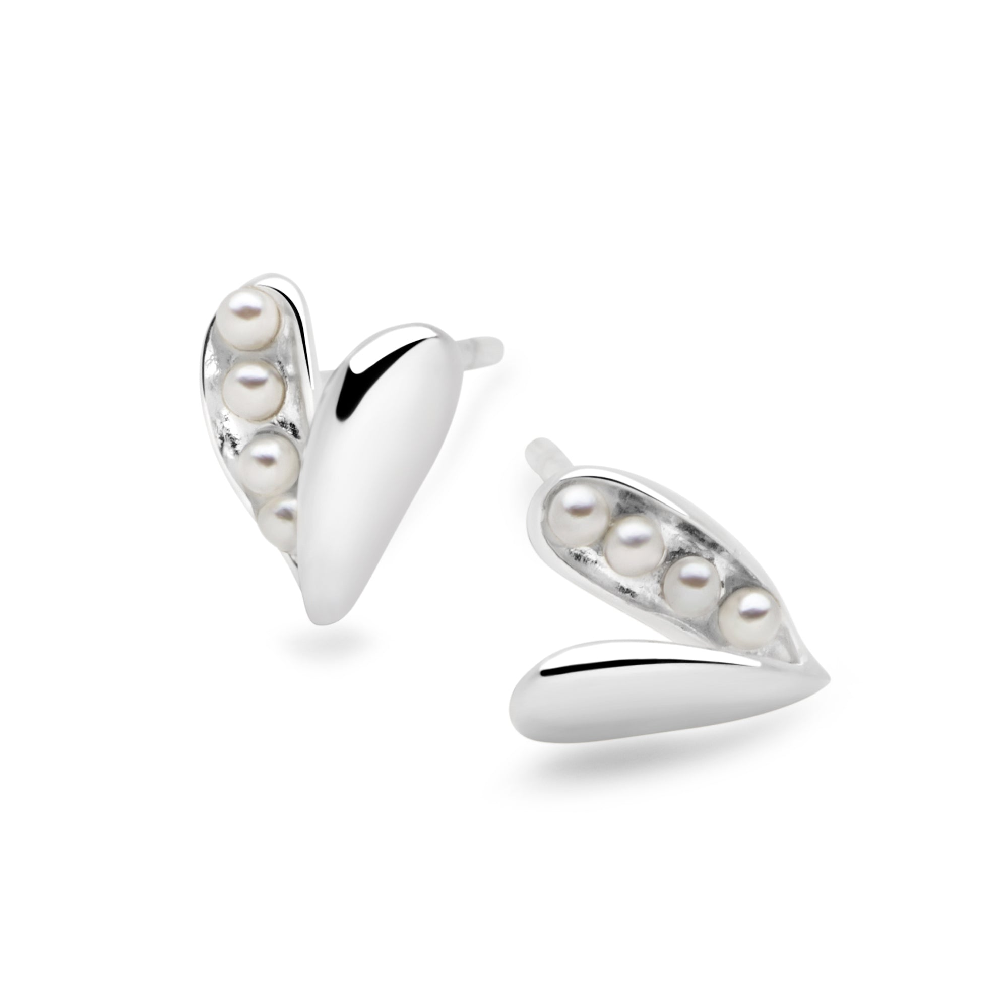 These adorable studs showcase an open pod of silver cleverly shaped into a heart, sweetly revealing four miniature white pearls nestled within.