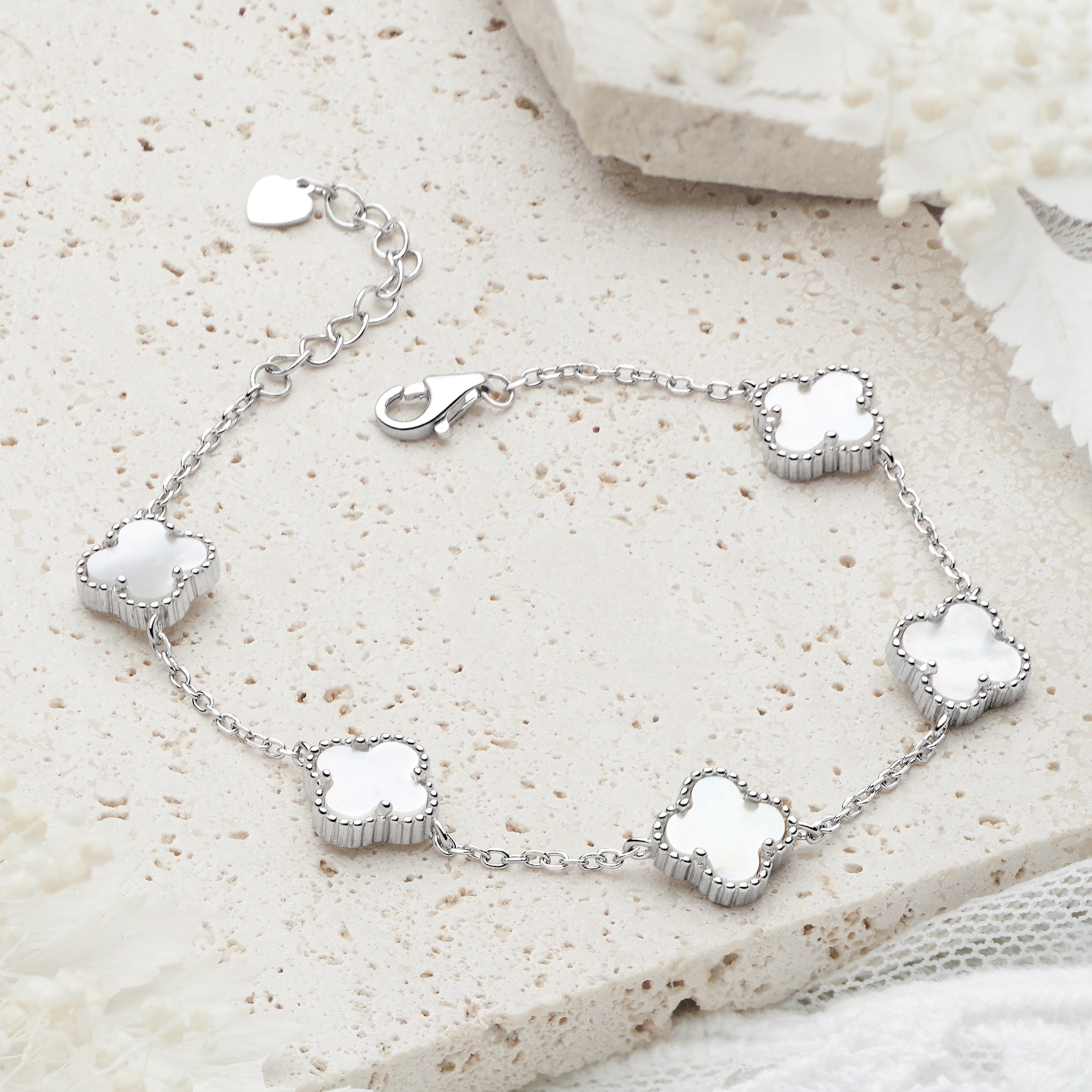 Refined and radiant, this bracelet showcases five luminous white mother-of-pearl clovers delicately linked along a rhodium-plated silver chain. Each clover symbolises luck, love, and harmony, while the subtle shimmer of mother-of-pearl adds timeless grace. A versatile piece that pairs beautifully with any look elegant on its own or layered for modern sophistication.