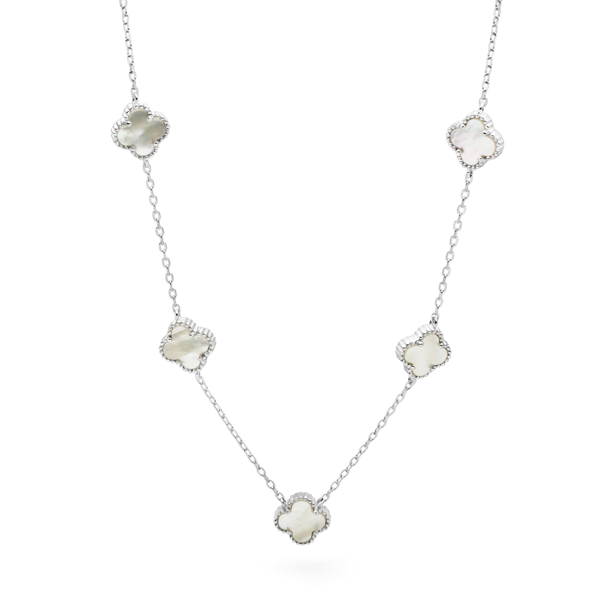 Effortlessly elegant, this silver necklace is adorned with five shimmering white mother-of-pearl clovers, delicately arranged on a rhodium-plated chain for lasting brilliance. The lustrous clovers capture light with every movement, creating a refined statement of luck, beauty, and grace. A modern classic for those who appreciate understated luxury.