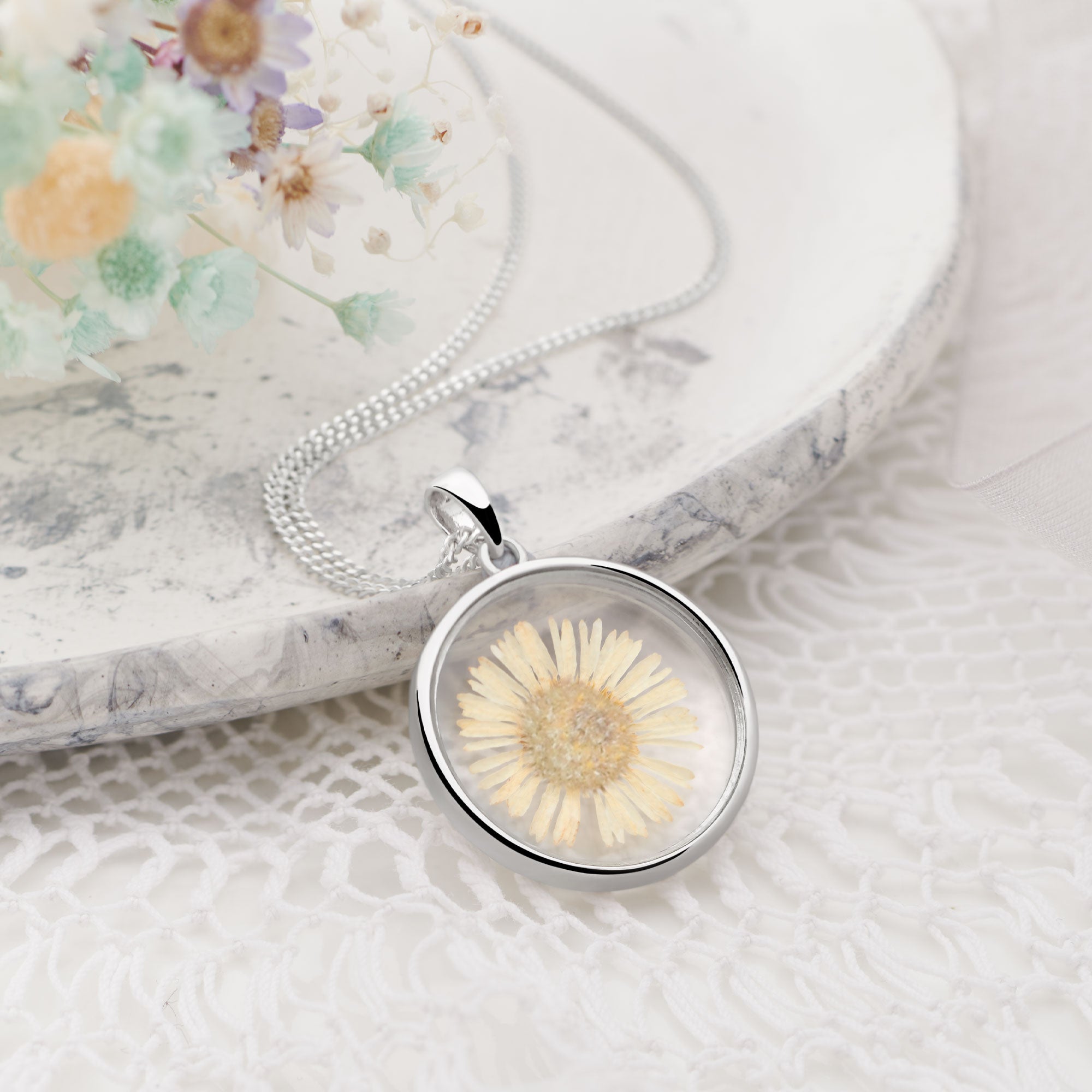 A pressed daisy sits inside a round case, framed in silver forever displaying its natural beauty.