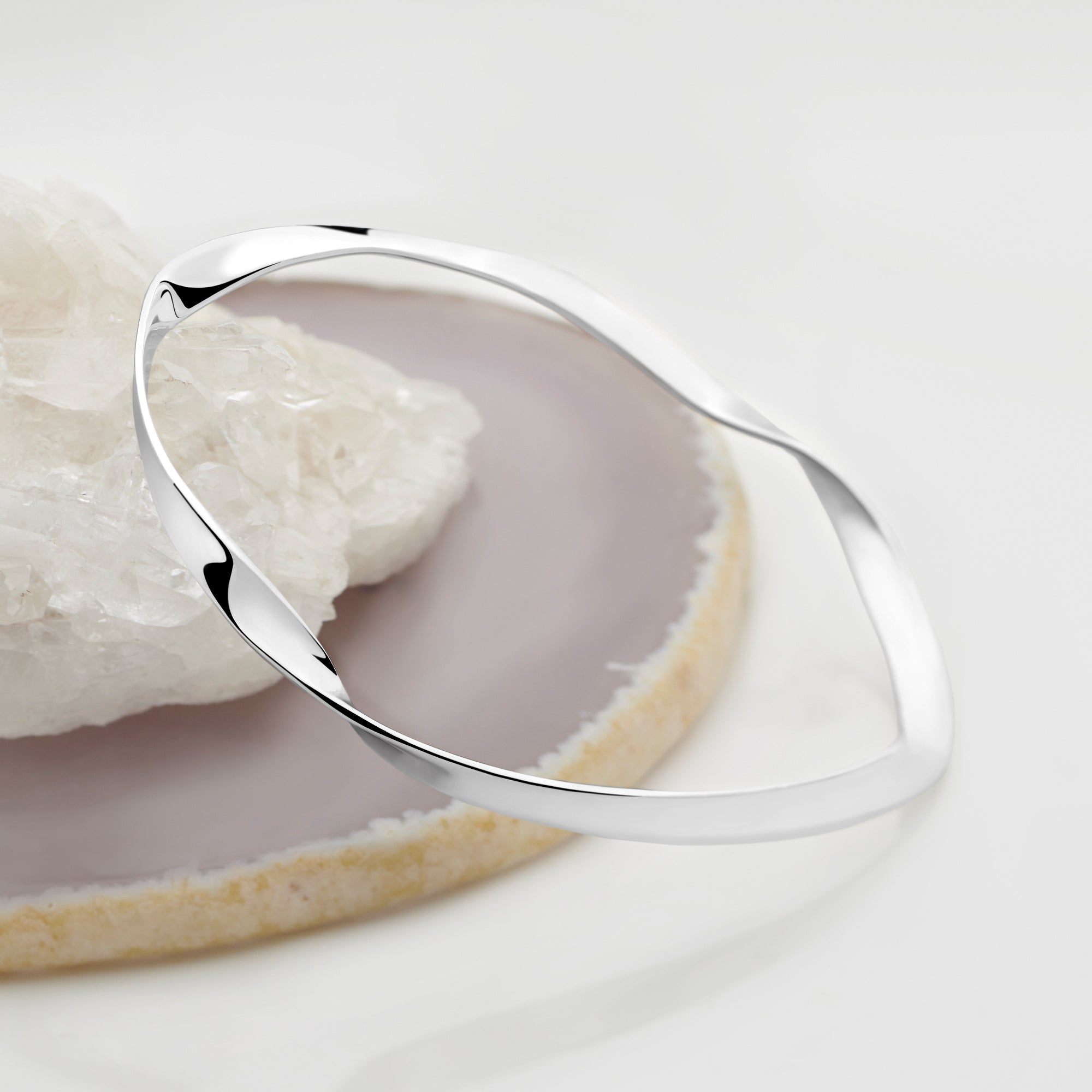 Fluid and refined, this sleek bangle is inspired by the graceful movement of a twisting ribbon. Expertly crafted in 925 sterling silver and smoothly polished to a luminous shine, its sculptural form wraps effortlessly around the wrist, catching the light from every angle.
