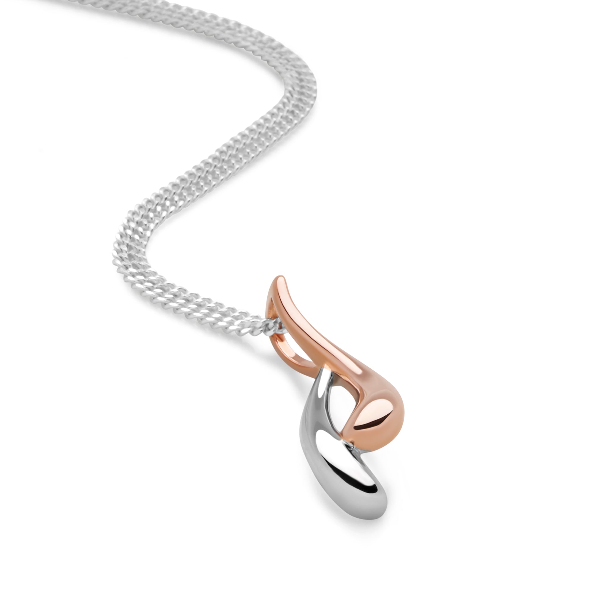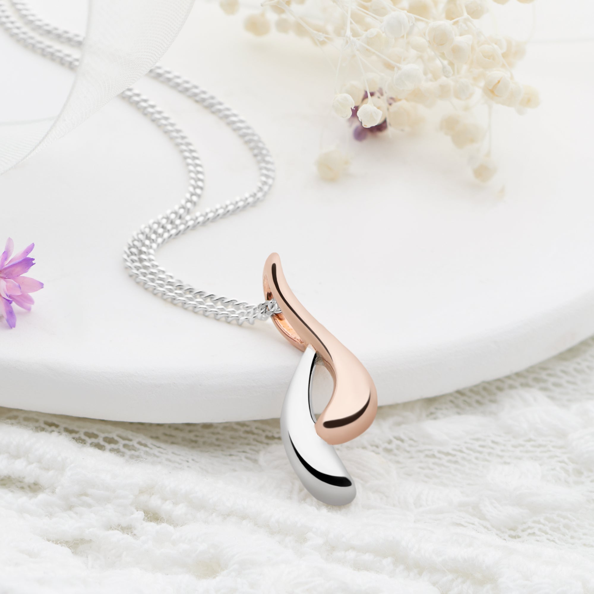 A romantic fusion of silver and rose gold plate playfully swoop together creating an elongated drop full of elegance and luxe.