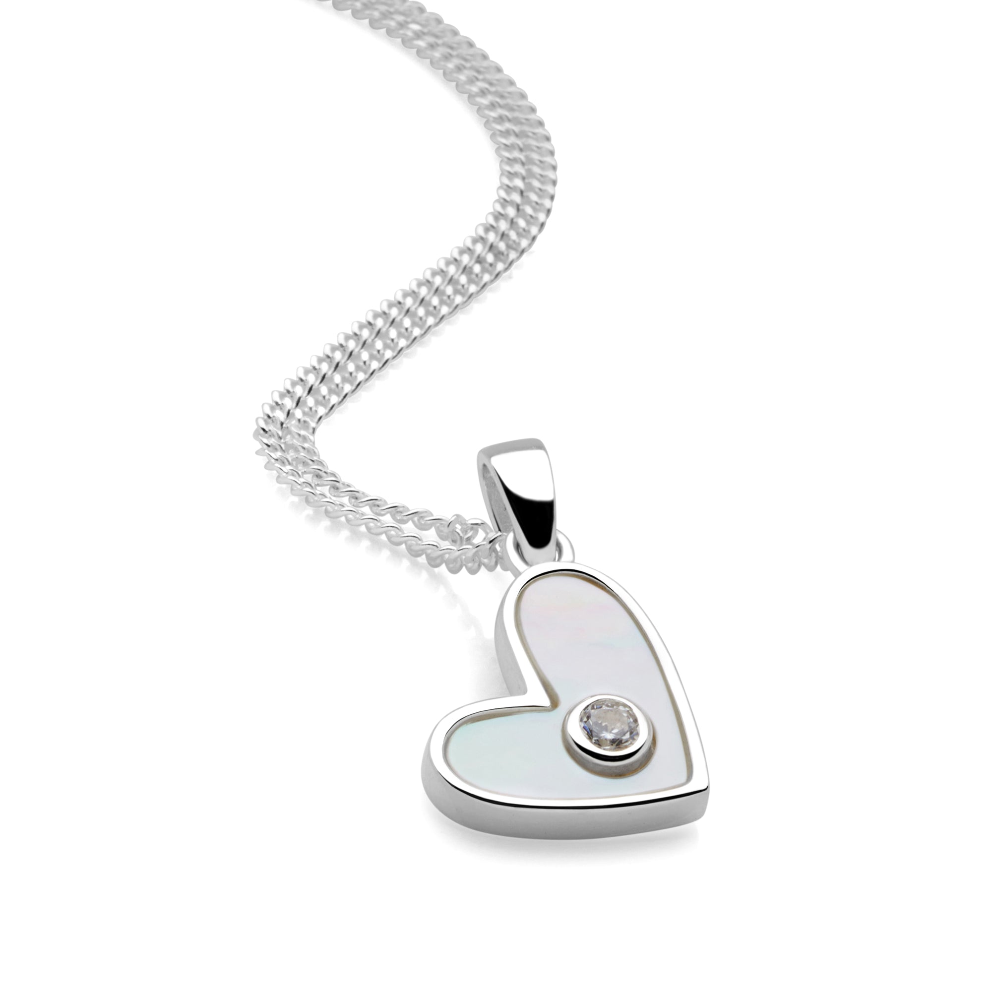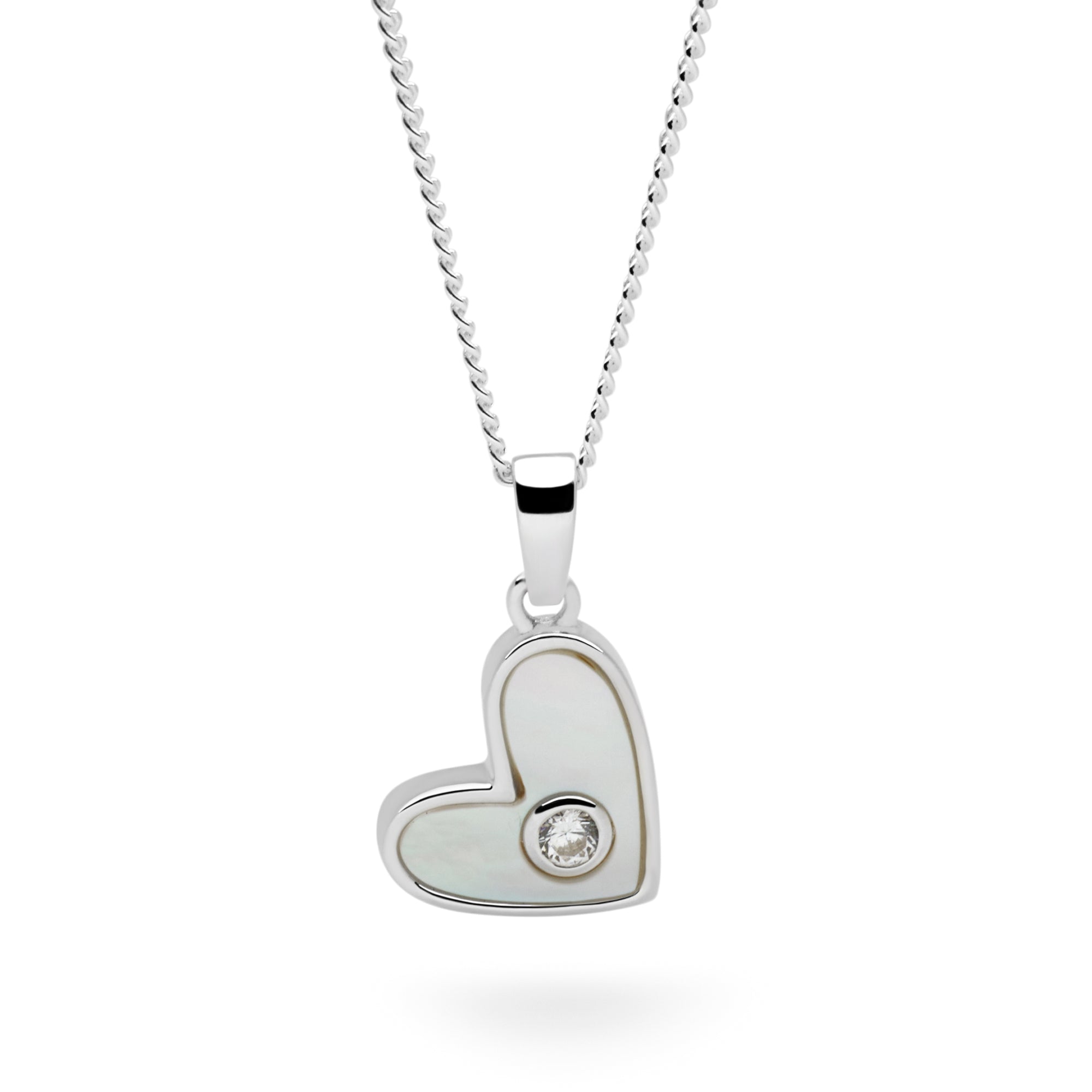 A heart-shaped sterling silver pendant designed to hang gently to the side, creating a modern, asymmetrical look. Inlaid with luminous white mother-of-pearl and finished with a clear cubic zirconia at the center, this piece captures light with subtle elegance and timeless charm.