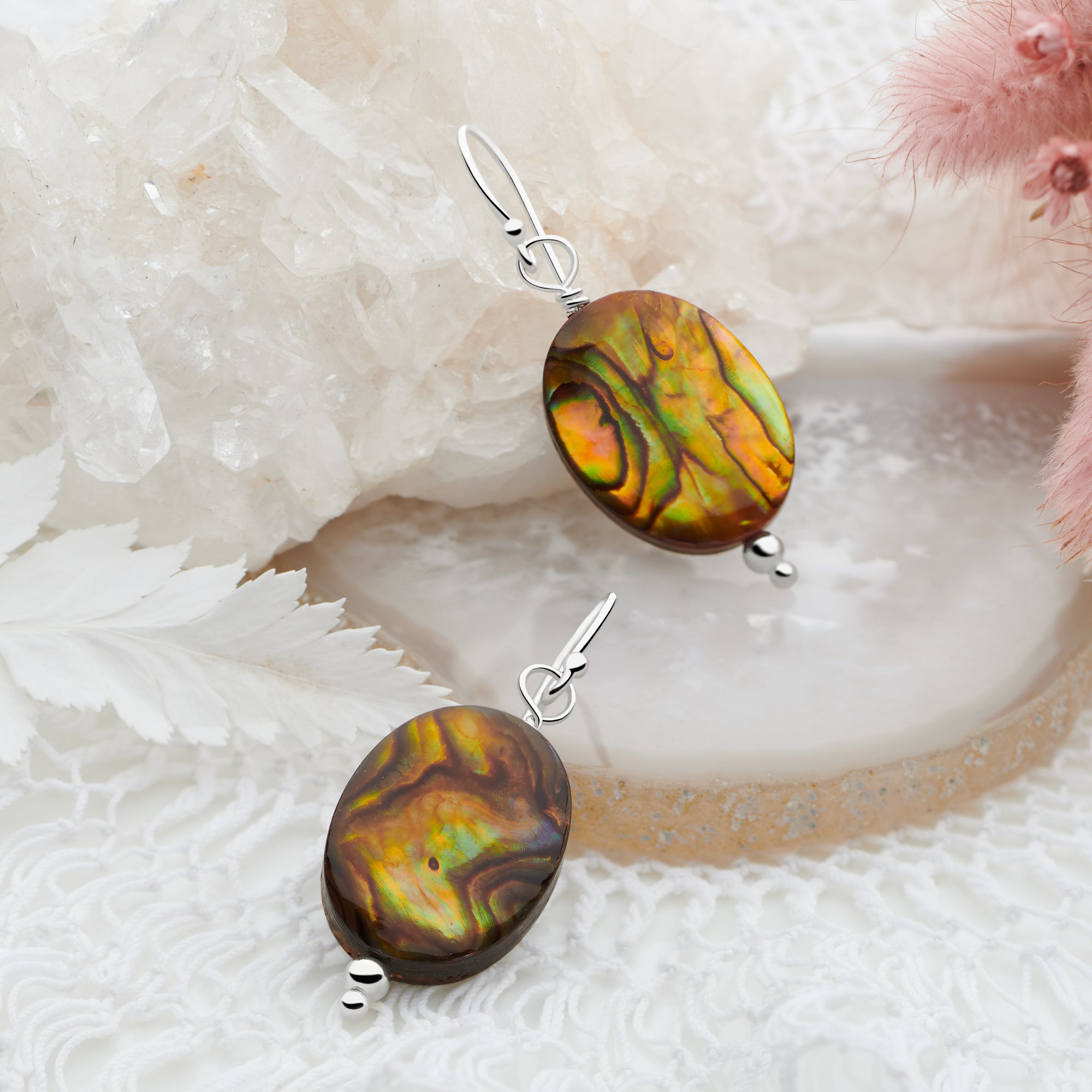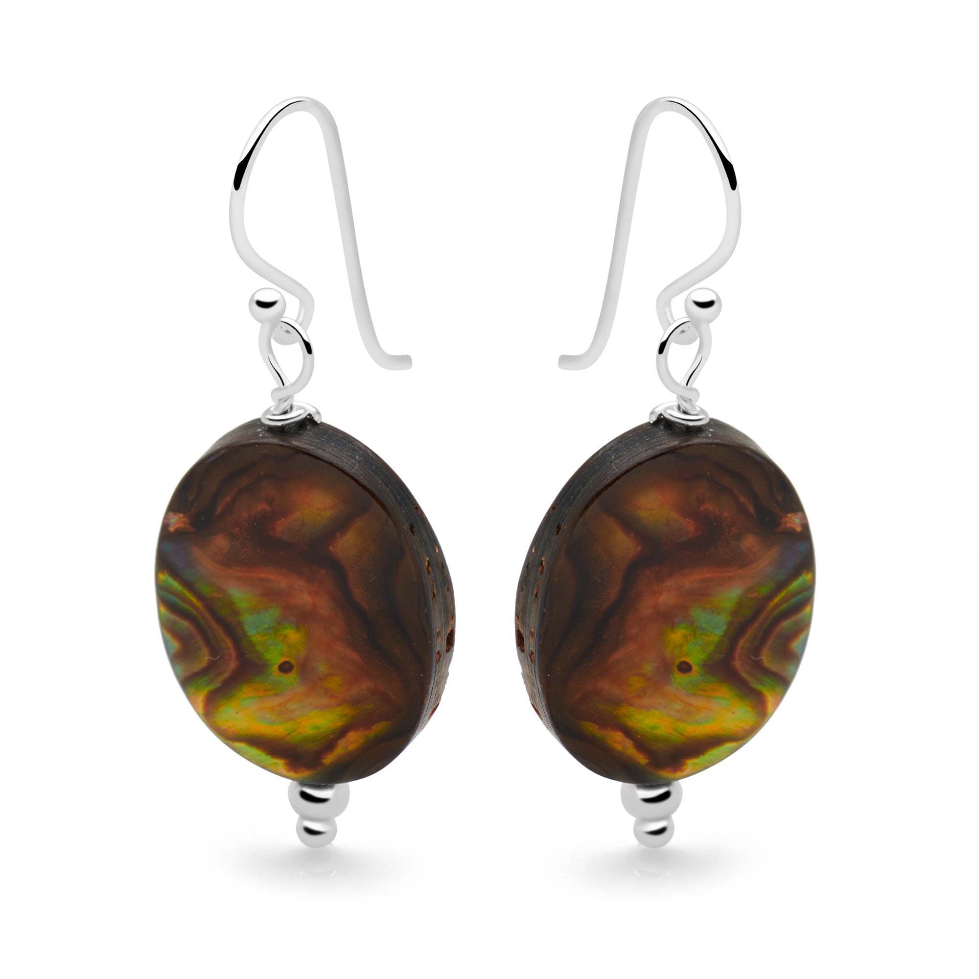 A mesmerising lozenge shaped coffee paua shell with iridescent flashes, just the right size to wear everyday but with a flash of that captivating shimmering delight!