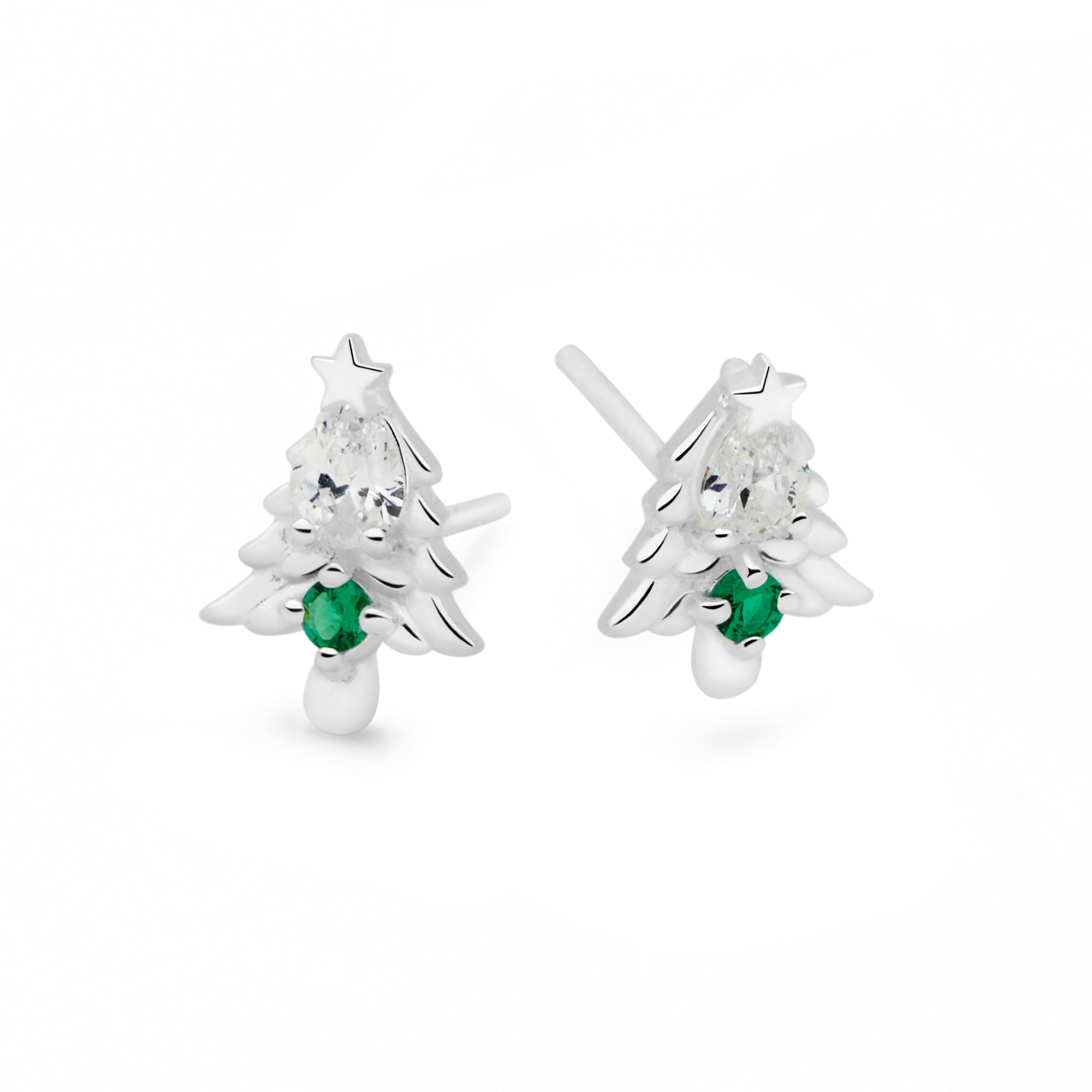 Miniature Christmas trees finished in silver are brought to life with sparkling clear and green cubic zirconia. These earrings make the perfect stocking filler.