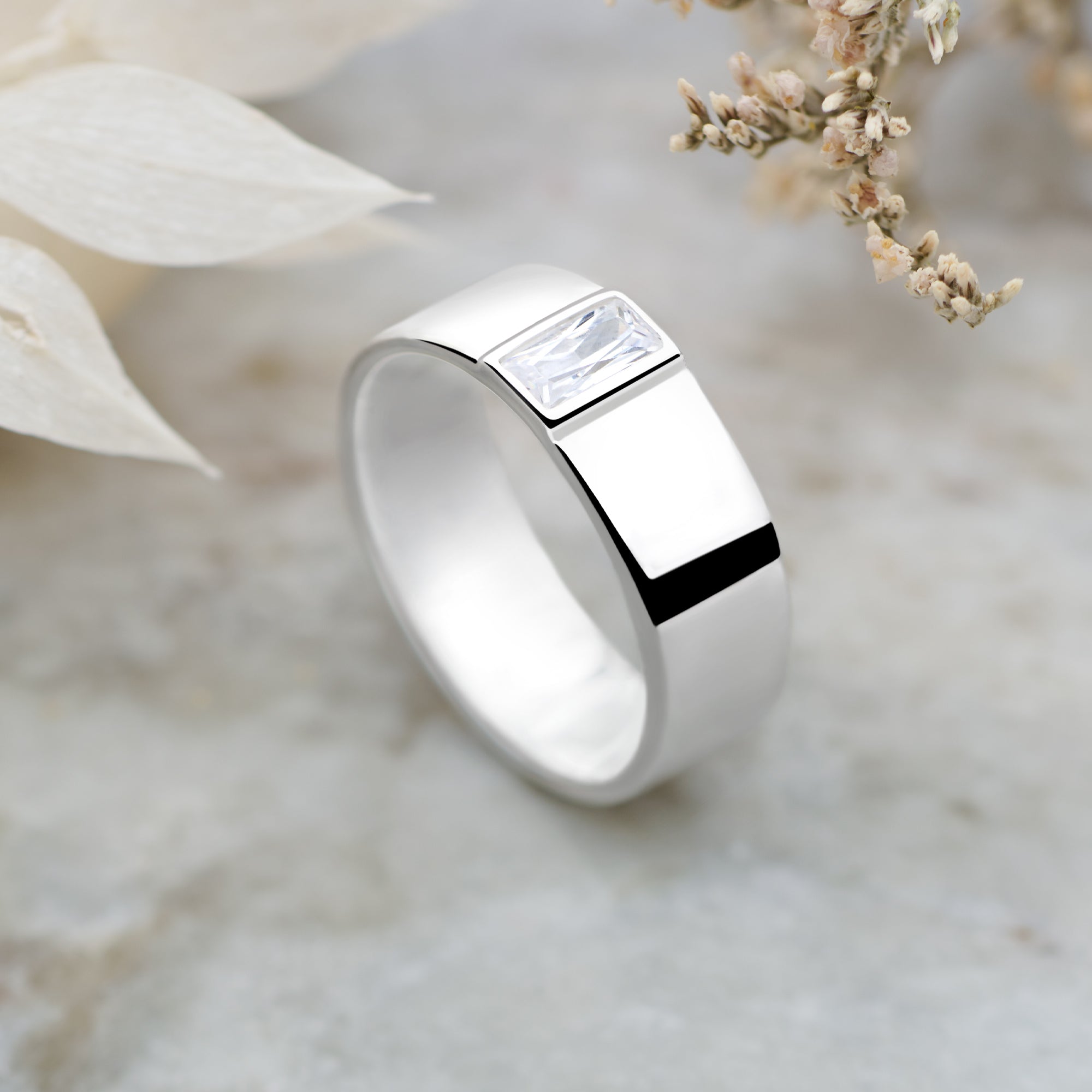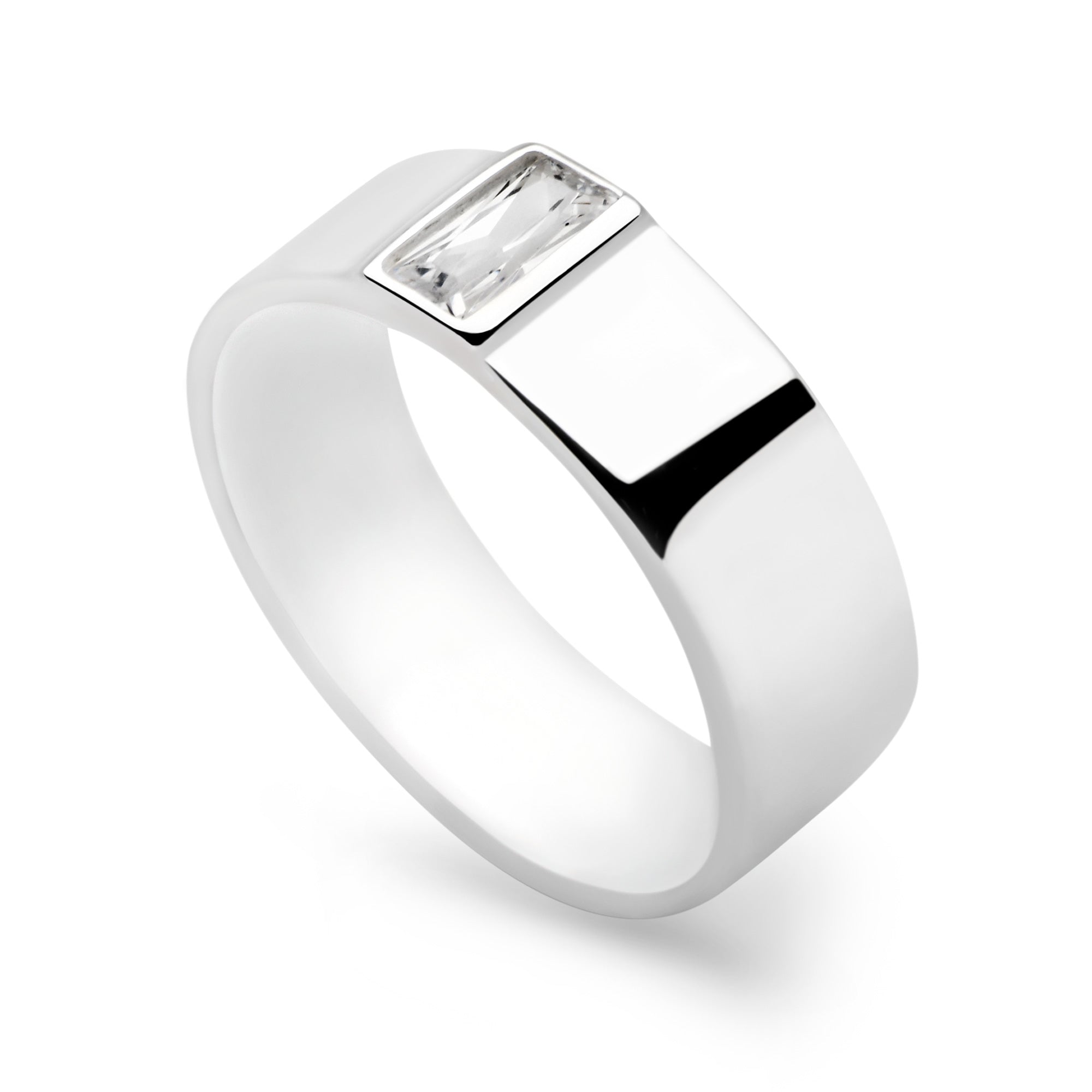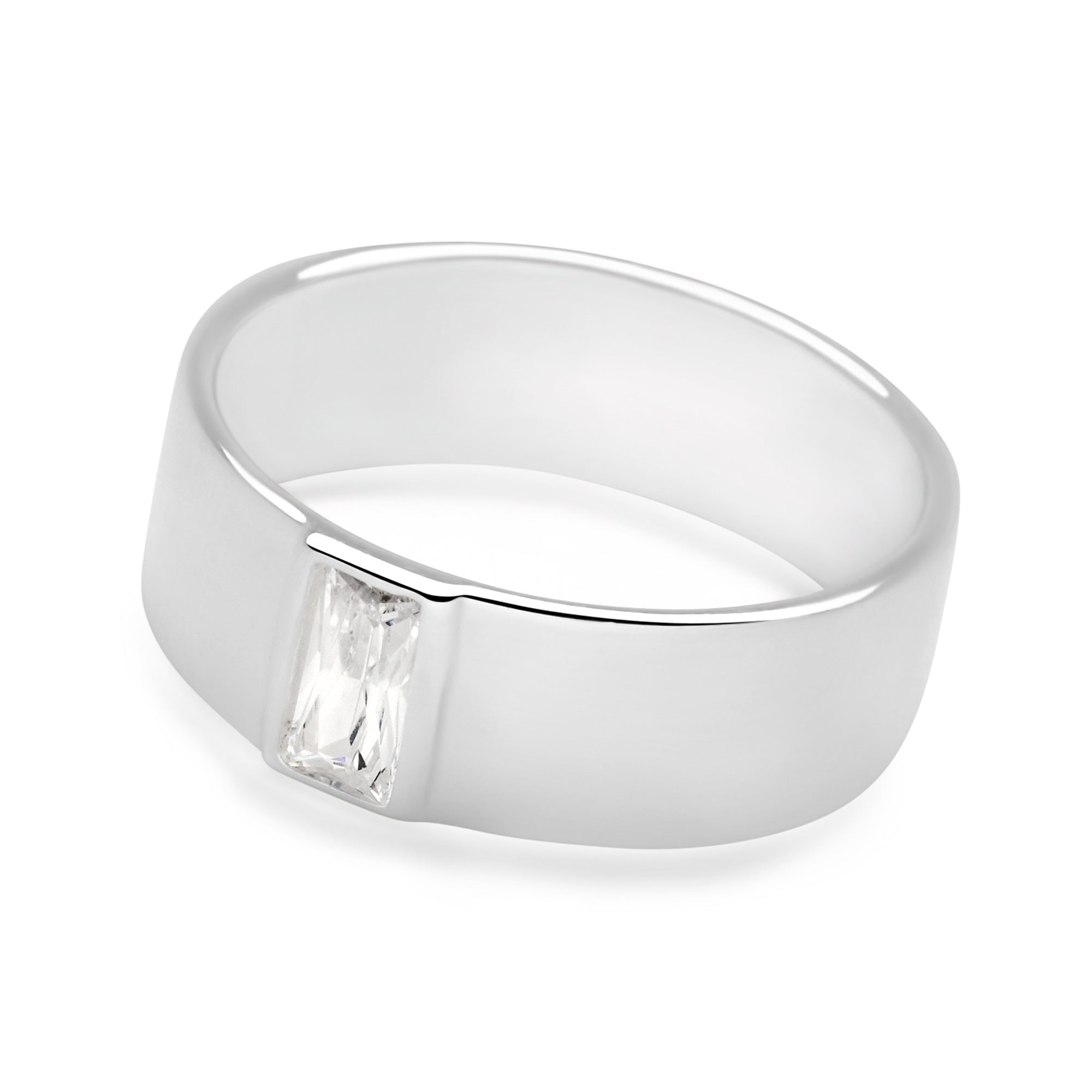Our classic flat silver band ring has been elegantly redeveloped with a rectangular sparkling cubic zirconia at it's heart.