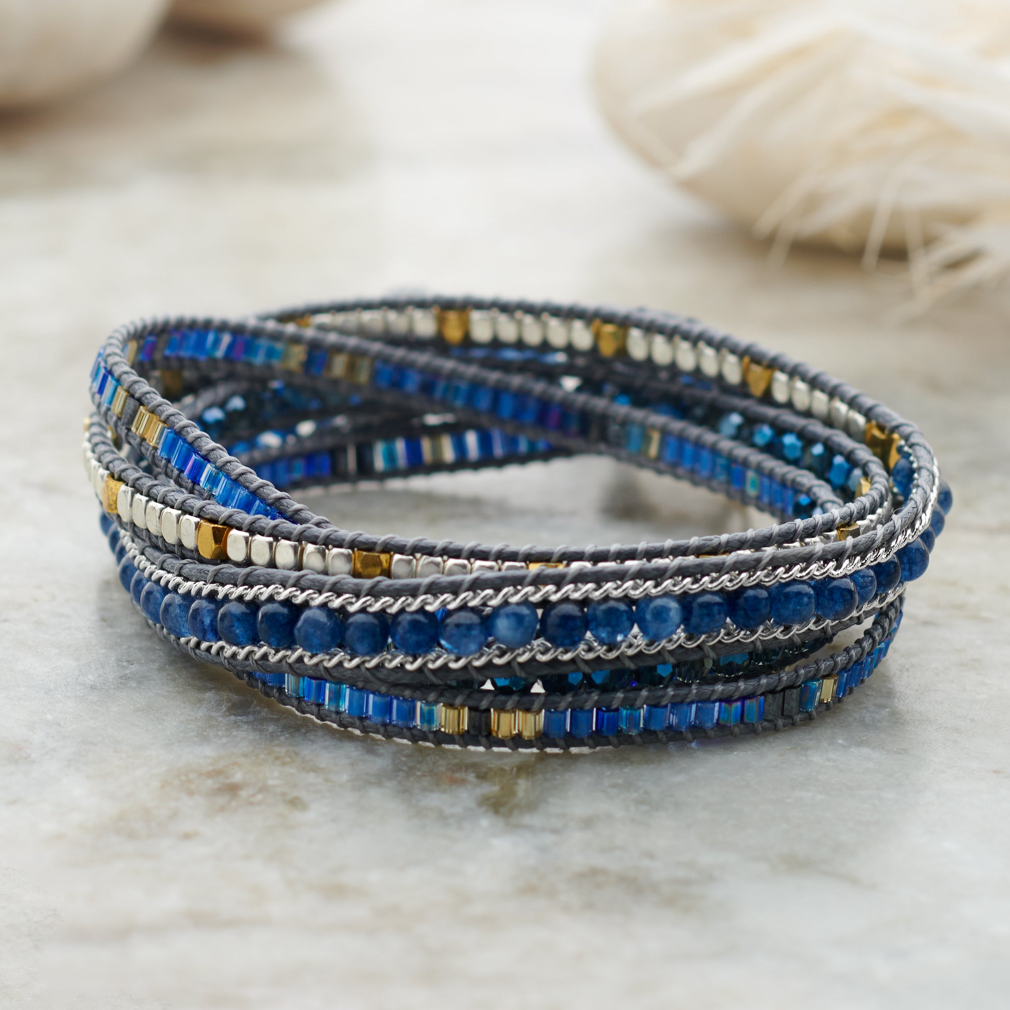 Embrace modern boho style with this striking six-strand wrap bracelet, featuring a rich mix of moody blue and metallic beads. The layered design wraps your wrist in texture and tone, blending cool, dusky hues with shimmering accents for a look that’s both bold and beautifully balanced.