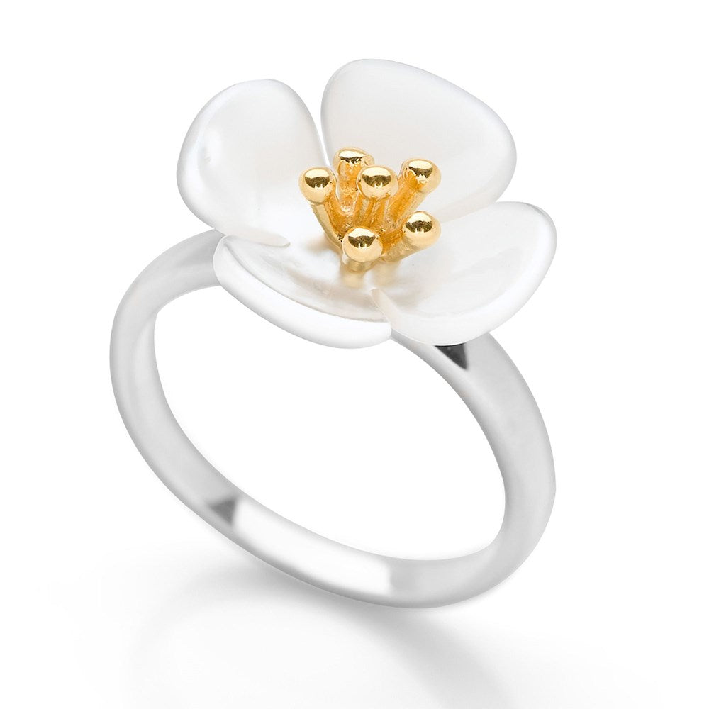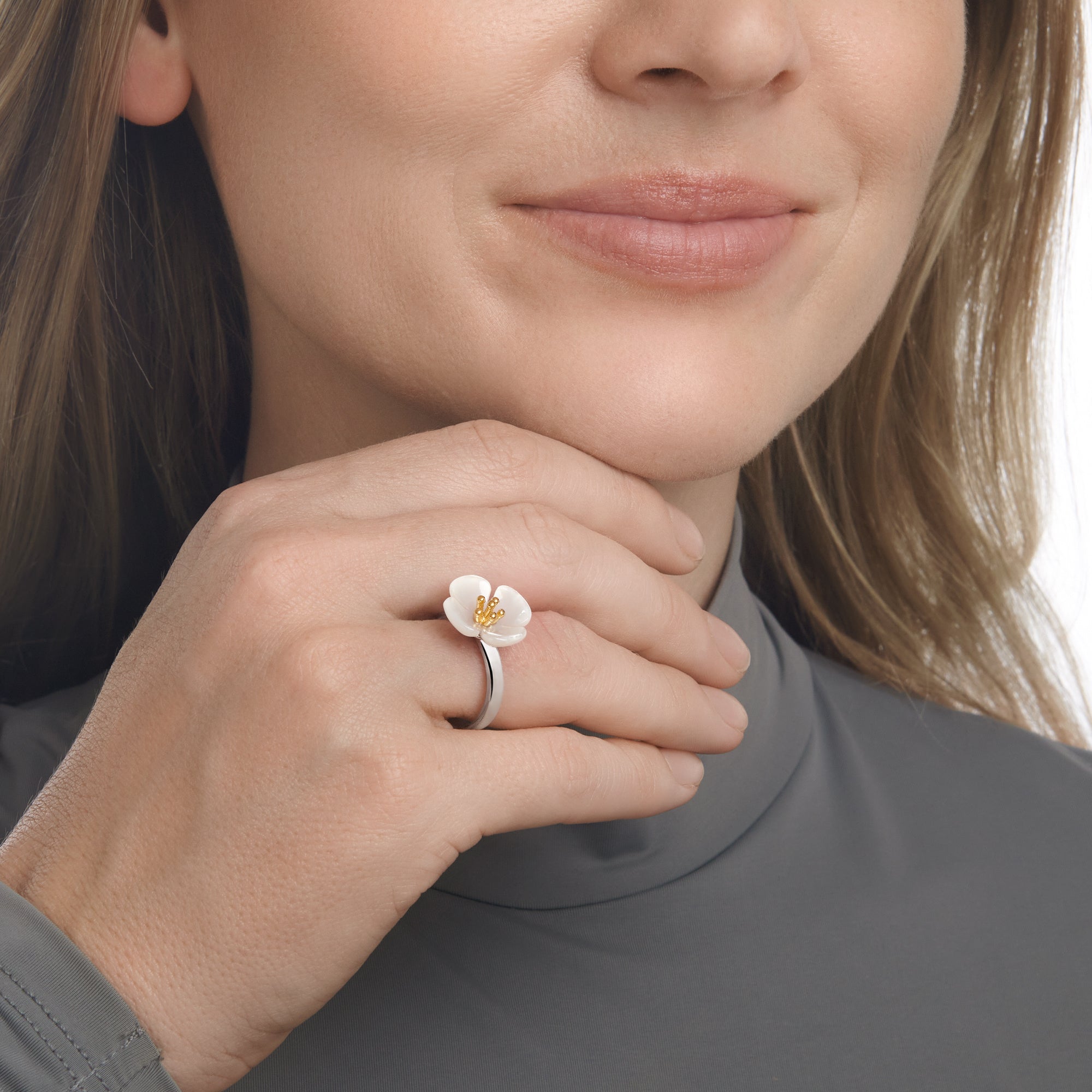 With soft focus, mother of pearl petals and a touch of 18k gold plate detail, this spray of delicate meadow flowers adds prettiness to your vintage finds.