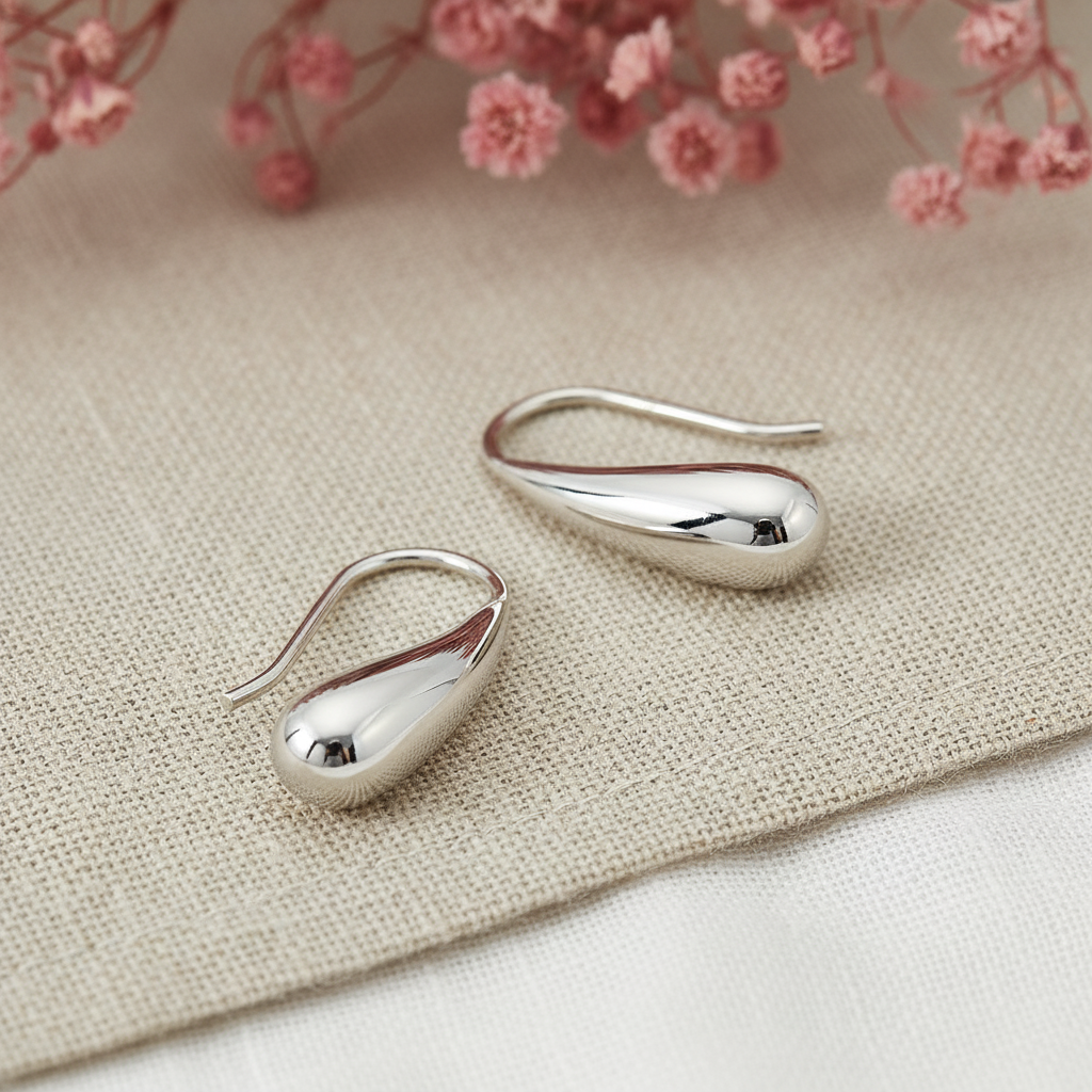 Gracefully understated, these silver teardrop earrings offer effortless elegance. Dropping just below the lobe, their gentle curve catches the light with every movement. Perfect for everyday wear or a refined finishing touch to an evening look.