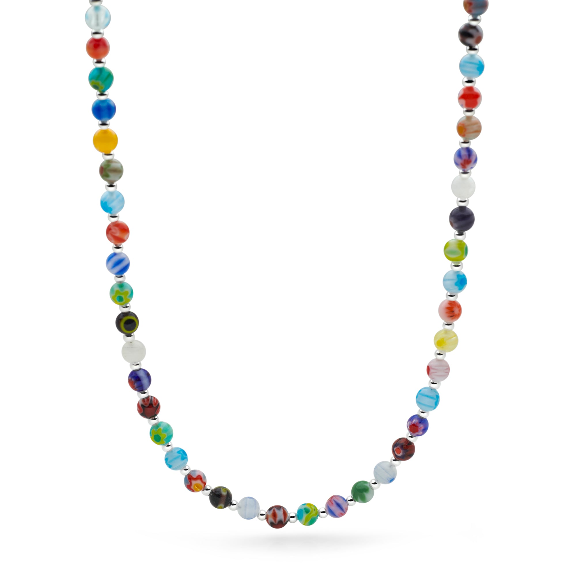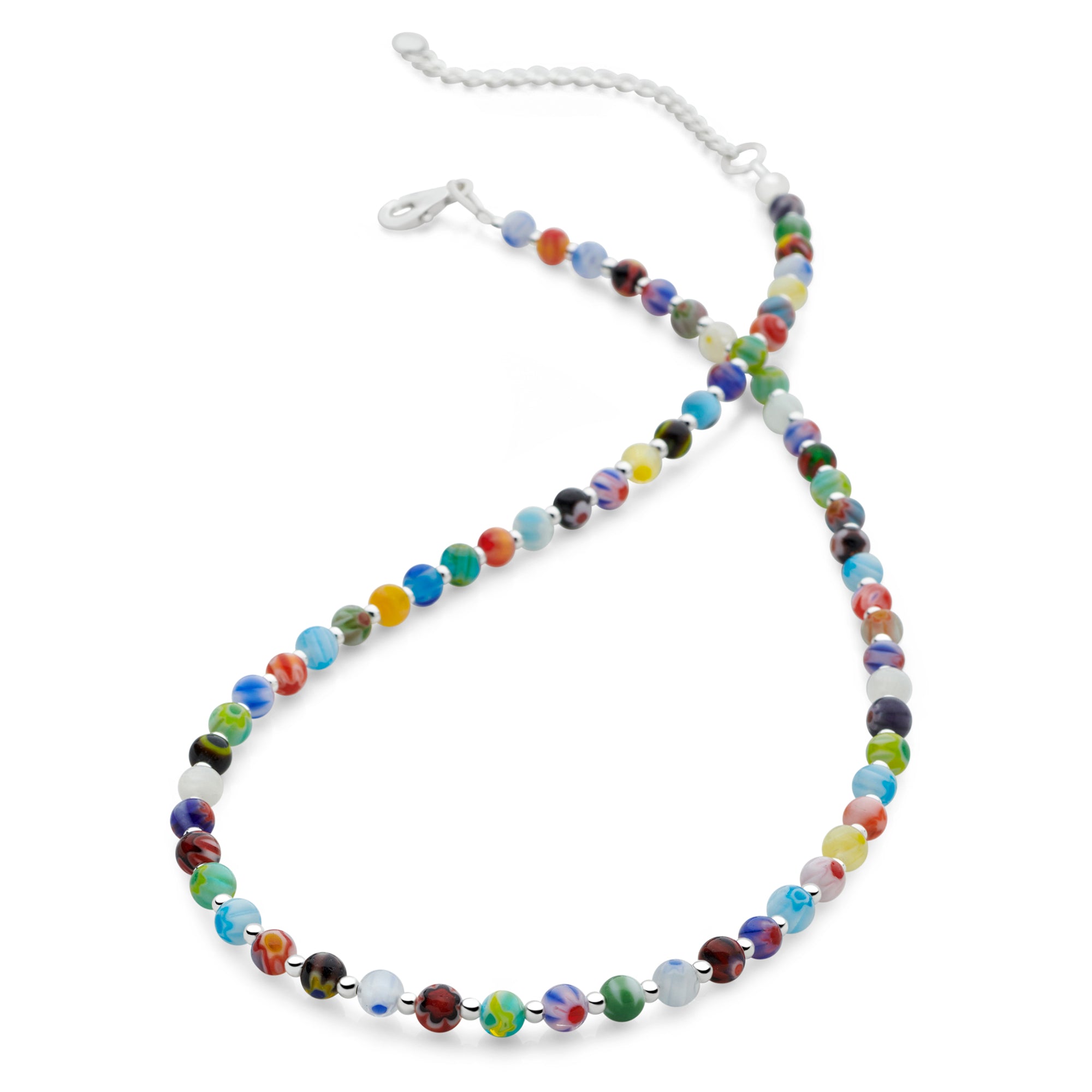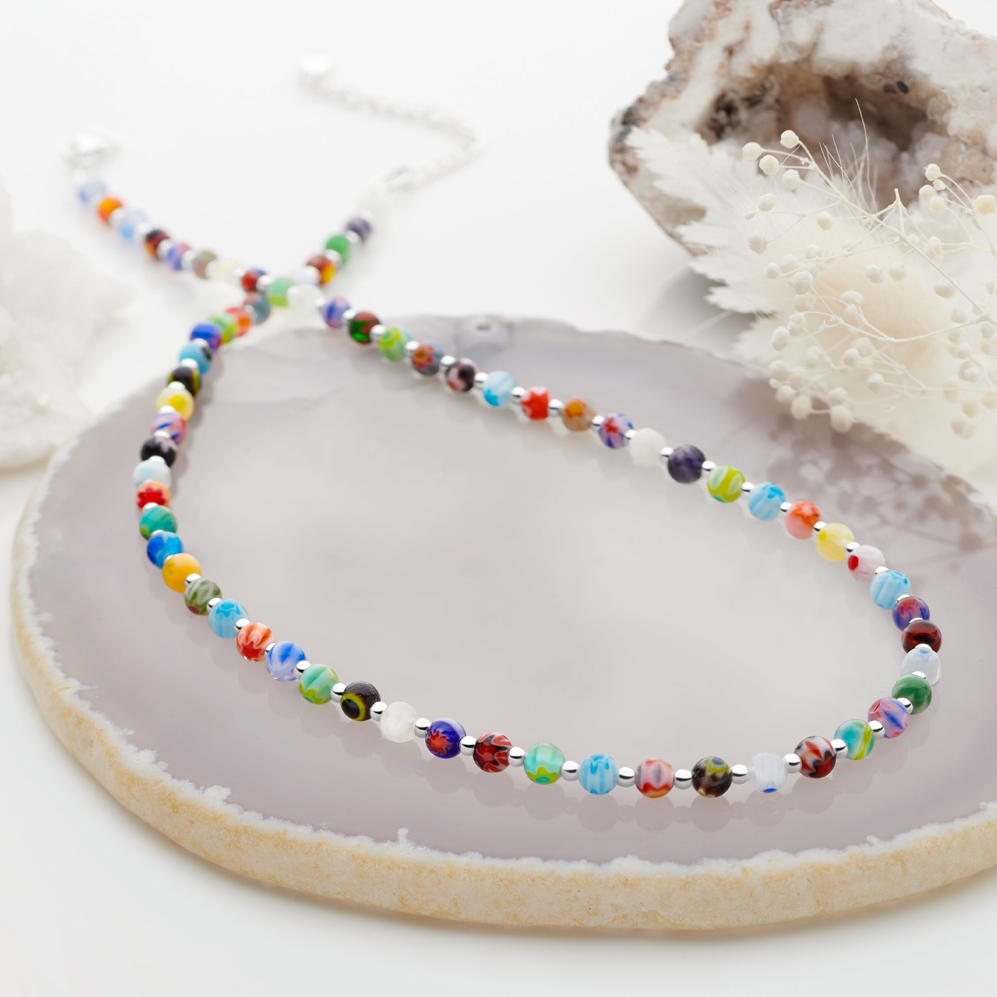 This fun necklace is made up of a colourful collection of Venetian glass style beads separated by miniature silver beads.